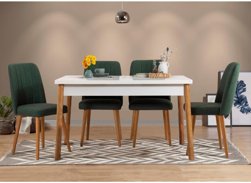 Hangulatos és stílusos étkezőhelyet hozhat létre skandináv asztal- és székkészletünkkelAlakítsa át étkezőjét meleg és hívogató térré skandináv asztal- és székkészletünkkel. Ez az 5 darabos készlet tökéletes azok számára, akik értékelik az egyszerűség és a funkcionalitás szépségét. Felemeli az étkezési élménytA 100% melaminbevonatú forgácslapból készült asztal és székkészlet nemcsak tartós, hanem könnyen tisztítható is, így biztosítva, hogy évekig megőrizze makulátlan állapotát. A 18 mm-es vastagság masszivitást és stabilitást kölcsönöz, így tökéletes a mindennapi használatra. Korszerűtlen dizájnA fa lábakkal és az atlanti fenyő, a fehér és a zöld színek kombinációjával ez a szett könnyedén illeszkedik bármilyen belső stílushoz, és egy csipetnyi eleganciát és kifinomultságot kölcsönöz. Az asztal és a székek letisztult vonalvezetése és minimalista kialakítása a nyugalom és a csend érzetét kelti, így minden étkezés különleges alkalom lesz. Páratlan kényelemA székkeretek erős fémből készültek, kiváló tartást és tartósságot biztosítva. A 100%-os vászonhabszövet luxusérzetet kölcsönöz, miközben maximális kényelmet biztosít a hosszú étkezések vagy összejövetelek során. A 49 cm-es ülésmagassággal ezek a székek úgy lettek kialakítva, hogy mindenki számára optimális kényelmet biztosítsanak. Technikai részletek: Az asztal vastagsága: 18 mm Étkezőasztal méretei: Szélesség: 120 cm, Magasság: 77 cm, Mélység: 75 cm. Székváz anyaga: A szék vázának anyaga: Fém Székszövet: 100% vászon hab Szék méretei: Szélesség: 47 cm, Magasság: 89 cm. Szék ülésmagassága: 49 cm Szín: atlanti fenyő, fehér és zöld Teremtsen olyan étkezőtermet, amely tükrözi egyedi stílusát és személyiségét skandináv asztal és székek készletünkkel. Rendelje meg most, és tapasztalja meg a kényelem, a stílus és a funkcionalitás tökéletes keverékét otthonában.