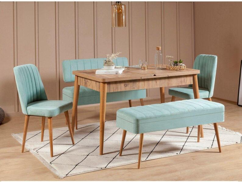 Változtassa meg étkezőhelyiségét az elegáns és sokoldalú, kihúzható étkezőasztal és székek készlettelTeremtsen felejthetetlen emlékeket szeretteivel e lenyűgöző, kihúzható étkezőasztal és székek szettje körül. A 100% melaminbevonatú forgácslapból készült készlet nemcsak tartós, hanem kifinomultságot és stílust is sugároz. Növelje az étkezési élménytA kihúzható étkezőasztal könnyedén alkalmazkodik az Ön igényeihez, így több vendéget tud fogadni, és meleg és hívogató légkört teremthet. Atlanti fenyőfa kivitelével természetes szépséget kölcsönöz helyiségének, míg a pisztáciazöld székek és pad színpompát és élénkséget kölcsönöznek. Páratlan kényelem és tartósságKényeztesse magát a 100% bársonyszövetből készült székek fényűző kényelmével, amelyeket úgy terveztek, hogy maximális alátámasztást és pihenést biztosítsanak étkezései során. Az asztal és a székek masszív szerkezete hosszú élettartamot biztosít, így ez a készlet hosszú évekre szóló bölcs befektetés. Technikai részletek: Szélesség: 129 cm, magasság: 75 cm, mélység: 80 cm (1 db). Nyitott asztal mérete: Szélesség: 163 cm, Magasság: 75 cm, Mélység: 80 cm. Székméret: Szélesség: 47 cm, Magasság: 90 cm, Mélység: 45 cm (2 db) Ülésmagasság: 49 cm Pad mérete: Ülőke: 1,5 cm (ülőke): Szélesség: 110 cm, Magasság: 50 cm, Mélység: 40 cm (1 db) Bank mérete: (1 db): Szélesség: 110 cm, Magasság: 85 cm, Mélység: 36 cm (1 db) Szövet: 100% bársony Szín: Atlanti fenyő és pisztácia zöld