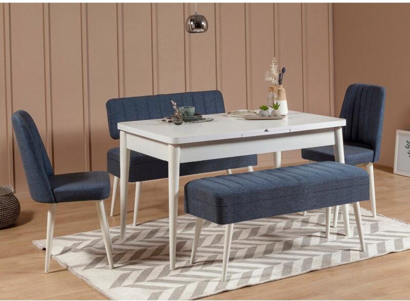 Változtassa meg étkezőhelyiségét az elegáns és sokoldalú, kihúzható étkezőasztal és székek készlettelTeremtsen meleg és hívogató hangulatot étkezőjében a lenyűgöző kihúzható étkezőasztal és székek készlettel. A 100% melaminbevonatú forgácslapból készült készlet nemcsak tartós, hanem olyan kifinomultságot is sugároz, amely feldobja étkezési élményét. Az elegancia találkozik a funkcionalitássalA 129 cm széles, 75 cm magas és 80 cm mély étkezőasztal elegáns kialakítású. Kihúzva 163 cm szélesre bővül, így bőséges helyet biztosít a családi összejövetelekhez és vacsorapartikhoz. A hozzá tartozó székek 47 cm-es (szélesség), 90 cm-es (magasság) és 45 cm-es (mélység) méreteikkel egyszerre nyújtanak kényelmet és stílust. A készlethez egy pad és egy bank is tartozik, sokoldalúvá és egyedivé téve az étkezőtermet. Páratlan kényelem és stílusA székek 100% vászonszövet kárpitozásúak, így puha és fényűző ülőalkalmatosságot biztosítanak. A fehér és a sötétkék színek kombinációja kortárs hangulatot kölcsönöz a térnek, így otthonának fókuszpontjává teszi azt. Technikai részletek: Étkezőasztal mérete: Asztali asztal mérete: Szélesség: 129 cm, Magasság: 75 cm, Mélység: 80 cm (1 db). Nyitott asztal mérete: Szélesség: 163magasság: 85 cm, Mélység: 36 cm (1 db) Szövet: 100% vászon Szín: Fehér és sötétkék cm, Magasság: 75 cm, Mélység: 80 cm. Szék mérete: 1 db: Szélesség: 47 cm, Magasság: 90 cm, Mélység: 45 cm (2 db) Ülésmagasság: 49 cm Pad mérete: 1,5 cm (ülőgarnitúra): Szélesség: 110 cm, Magasság: 50 cm, Mélység: 40 cm (1 db) Bank mérete: (1 db): Szélesség: 110 cm, magasság