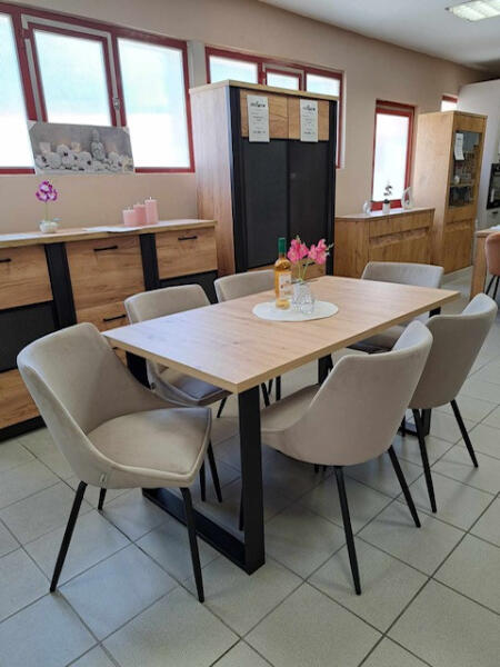 Alberta étkezőgarnitúra – modern bővíthető Zoé asztallal és 6 db Alberta székkel (kép szerinti színben) Az Alberta étkezőgarnitúra letisztult formavilágával, prémium alapanyagaival és kiváló használhatóságával ideális választás a modern otthonok étkezőibe, konyháiba vagy vendéglátóhelyekre . A garnitúra egy Zoé típusú bővíthető étkezőasztalból és 6 db Alberta székből áll, a képen látható színösszeállításban . A Zoé asztal duplungolt (vastagított) asztallappal és fekete porfestett fém lábakkal készül, amely modern megjelenést és nagyfokú stabilitást biztosít. A 150 cm-es hossz +40 cm vendéglappal bővíthető, így akár 8 fő számára is kényelmes étkezést tesz lehetővé. A hozzá tartozó Alberta székek prémium komfortot nyújtanak: vázuk tömör bükkfa és rétegelt lemez kombinációja, ülőfelületük és háttámlájuk pedig nagy sűrűségű HR hideghabbal párnázott – ezáltal hosszú távon is kényelmes és formatartó. ️ Zoé asztal jellemzői: Hosszúság (zárt): 150 cm