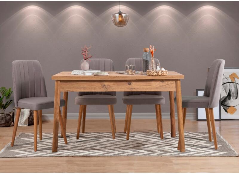 Készítsen maradandó emlékeket modern és stílusos asztal- és székkészletünkkelAlakítsa át étkezőjét melegséggel, eleganciával és kényelemmel teli térré 5 darabos asztal- és székkészletünkkel. A legnagyobb gondossággal és a részletekre való odafigyeléssel készített készletet úgy terveztük, hogy maradandó emlékeket teremtsen szeretteivel. Növelje az étkezési élménytA 100% melaminbevonatú forgácslap biztosítja a tartósságot és a hosszú élettartamot, így ez a készlet tökéletes kiegészítője otthonának. A 18 mm-es vastagság növeli a stabilitást, így évekig élvezheti a számtalan étkezést és összejövetelt. Páratlan stílus és kifinomultságA modern és újszerű koncepcióval rendelkező asztal- és székkészletünk könnyedén ötvözi a rusztikus, skandináv és vidéki stílusokat. Az atlanti fenyő és a szürke színek eleganciát és sokoldalúságot kölcsönöznek bármilyen dekorációnak, így tökéletesen illeszkedik minden otthonba. Páratlan kényelem és támogatásAz étkezőasztal fa lábai stabilitást és szilárdságot, míg a fémből készült székkeret tartósságot biztosít. A székek 100%-os bársony habszivacs anyagú szövete páratlan kényelmet biztosít, így Ön és vendégei stílusosan pihenhetnek és élvezhetik az étkezéseket. Technikai részletek: Anyag: 1.1. 1: Anyag: 100% melaminbevonatú forgácslap Vastagság: 18 mm Fa lábak az étkezőasztalhoz Székváz: Fém Székszövet: hab: 100% bársony Az étkezőasztal méretei: Szélesség: 120 cm, Magasság: 77 cm, Mélység: 75 cm. Szék méretei: Szélesség: 47 cm, Magasság: 89 cm. Szék ülésmagassága: 49 cm Szín: Atlantic fenyő és szürke Asztal és székek szettünkkel olyan étkezési élményt teremthet, amilyet még nem látott. Rendeljen most, és szerezzen felejthetetlen emlékeket szeretteivel.
