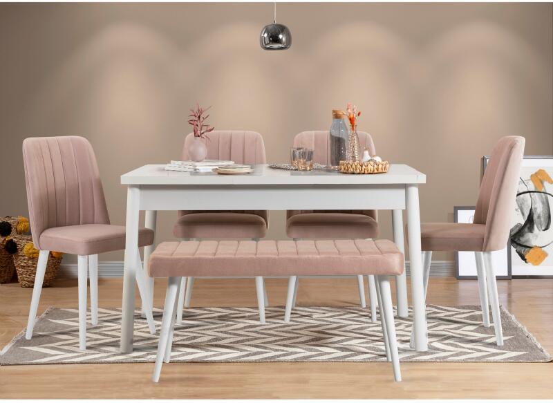 Hangulatos és stílusos étkezőhelyet hozhat létre skandináv asztal- és székkészletünkkelAlakítsa át étkezőhelyét meleg és hívogató térré a kiváló asztal- és székkészletünkkel. A szeretettel és a részletekre való odafigyeléssel készített készletet úgy terveztük, hogy kényelmet és stílust hozzon otthonába. Tapasztalja meg a páratlan minőségetEz a készlet 100% melaminbevonatú forgácslapból készült, így tartósan megmarad. A 18 mm-es vastagság biztosítja a tartósságot és a stabilitást, míg a falábak eleganciát kölcsönöznek. Az étkezőasztal 120 cm széles, 77 cm magas és 75 cm mély méretei révén bőséges helyet biztosít a család és a barátok számára, hogy összegyűlhessenek körülötte. Fényűző kényelemA stabil fémvázzal és 100% bársony habszivacs anyaggal ellátott székek fényűző ülőalkalmatosságot nyújtanak. Szélességük 47 cm, magasságuk 90 cm, ülésmagasságuk 49 cm, így optimális kényelmet biztosítanak a hosszabb ideig tartó üléshez. A fémvázzal és bársonyhabszövettel ellátott pad sokoldalúságot biztosít, és egy további vendéget is el tud fogadni. Kortalan eleganciaA fehér és a kőszín kombinációja időtlen és elegáns megjelenést kölcsönöz ennek a garnitúrának. A skandináv koncepció kifinomultságot kölcsönöz bármely lakberendezési stílusnak, így tökéletes kiegészítője lesz otthonának. Technikai részletek: Asztal és székek készlet (6 darab) 100% melamin bevonatú forgácslap, 18 mm vastagsággal Fából készült lábak a nagyobb stabilitás érdekében Étkezőasztal: Szélesség: 120cm, Magasság: 77cm, Mélység: 75cm. Székváz: Asztali asztal és székváz: Fém Székszövet: 100% bársony hab Szék (4 db): Szék (4 db): Szélesség: 47cm, Magasság: 90cm, Ülésmagasság: 49cm. Pad keret: Fém Pad szövet: 100% bársony hab Pad (1 db): A pad (1 db): A padot egy darabból állítja össze: Szélesség: 100cm, Magasság: 48cm, Mélység: 39cm. Szín: Fehér és kő