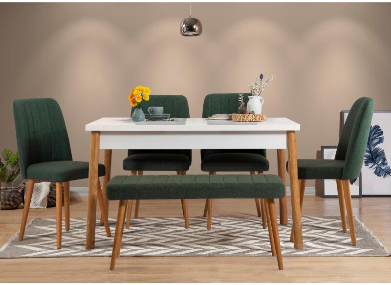 Hangulatos és stílusos étkezőhelyet hozhat létre skandináv asztal- és székkészletünkkelAlakítsa át étkezőhelyét meleg és hívogató térré a kiváló skandináv asztal- és székgarnitúránkkal. A szeretettel és a részletekre való odafigyeléssel készített készletet úgy terveztük, hogy egyszerre hozzon kényelmet és stílust otthonába. Tapasztalja meg a skandináv design szépségétA minimalista és funkcionális skandináv dizájn által inspirált asztal- és székkészlet tökéletes kiegészítője bármely modern otthonnak. A letisztult vonalak, a karcsú falábak, valamint az atlanti fenyő és a fehér-zöld színek kombinációja harmonikus és hívogató légkört teremt. Kompromisszummentes minőség és tartósságA 18 mm vastagságú, 100% melaminbevonatú forgácslapból készült készletet tartós használatra tervezték. A falábak stabilitást és szilárdságot biztosítanak, így biztosítva, hogy még évekig sok emlékezetes étkezést élvezhessen szeretteivel. Kényelmes ülőhely mindenkinekA készlet négy széket és egy padot tartalmaz, mindegyiket 100% lenvászon habszivacs szövet kárpitozással. A székkeretek erős fémből készültek, kiváló tartást és stabilitást biztosítva. A 49 cm-es ülésmagassággal a székek optimális kényelmet biztosítanak a hosszabb ideig tartó üléshez. Technikai részletek: Asztali méretek: Szélesség: 120 cm, magasság: 77 cm, mélység: 75 cm. Szék méretei: Szélesség: 47 cm, Magasság: 90 cm Szélesség: 100 cm, Magasság: 48 cm, Mélység: 39 cm Szék váza: Fém Székszövet: 100% vászon hab Pad váz: Fém Pad szövet: Hab: 100% vászon Szín: atlanti fenyő, fehér és zöld Ne hagyja ki a lehetőséget, hogy egy lenyűgöző étkezőhelyet hozzon létre, amely egyesíti a kényelmet, a stílust és a tartósságot. Rendelje meg skandináv asztal és székek készletünket még ma, és emelje lakberendezését egy teljesen új szintre.