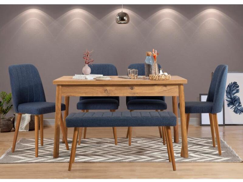 Készítsen maradandó emlékeket a modern asztal és szék szettünkkel Alakítsa át étkezőhelyét a kényelem és a stílus fellegvárává gyönyörű asztal- és székkészletünkkel. A legnagyobb gondossággal és a részletekre való odafigyeléssel készített 6 darabos készletet úgy terveztük, hogy maradandó emlékeket teremtsen szeretteivel. Növelje az étkezési élményt Tapasztalja meg az elegancia és a funkcionalitás tökéletes keverékét asztal- és székkészletünkkel. A 100% melamin bevonatú forgácslap biztosítja a tartósságot és a karcolással szembeni ellenállást, így ideális a mindennapi használatra. A falábak melegséget és kifinomultságot kölcsönöznek étkezőhelyének, míg a fém székkeretek stabil tartást biztosítanak. Páratlan kényelem és stílus Kényeztesse magát a tökéletes kényelemmel a 100%-ban vászonhabszövetből készült kárpitozású székeinkkel és padunkkal. A plüss ülőfelület és az ergonomikus kialakítás órákig tartó pihenést és élvezetet biztosít. Az atlanti fenyő és a tengerészkék színkombináció modern és frissítő jelleget kölcsönöz bármely térnek, így tökéletesen illeszkedik a különböző belsőépítészeti stílusokhoz, beleértve az újszerű, rusztikus és skandináv stílusokat is. Technikai részletek: