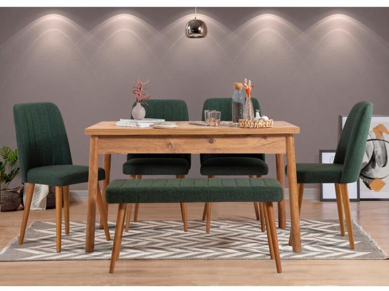Készítsen maradandó emlékeket a modern asztal és szék szettünkkel Alakítsa át étkezőhelyét a kényelem és a stílus fellegvárává gyönyörű asztal- és székkészletünkkel. A legnagyobb gondossággal készített 6 darabos készletet úgy terveztük, hogy maradandó emlékeket teremtsen szeretteivel. Növelje az étkezési élményt Tapasztalja meg az elegancia és a funkcionalitás tökéletes keverékét asztal- és székkészletünkkel. A 100% melaminbevonatú forgácslap biztosítja a tartósságot és a könnyű karbantartást, míg a falábak egy csipetnyi kifinomultságot kölcsönöznek. Páratlan kényelem Kényeztesse magát a tökéletes kényelemmel a 100%-ban vászonhabszövetből készült kárpitozású székeinkkel és padunkkal. A fémből készült székkeretek stabil tartást biztosítanak, míg a padkeret egyedi színt kölcsönöz étkezőhelyének. Modern design, végtelen lehetőségek Asztal- és székkészletünk a modern, újszerű, rusztikus, skandináv és vidéki stílusok tökéletes ötvözete. Az atlanti fenyő és a zöld színkombináció frissítő és élénk színt kölcsönöz bármely térnek, így sokoldalúan kiegészíti lakberendezését. Technikai részletek: