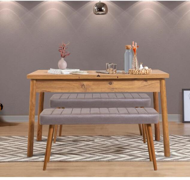 Alakítsa át étkezőjét egy kényelmes és hívogató térséggé az Extendable Dining Table & Bench Set készletünkkel. Ez a 3 darabos szett arra lett tervezve, hogy a családokat és barátokat összehozza, felejthetetlen emlékeket teremtve az asztal körül. Elegáns dizájn minden otthonhoz A 100%-ban melamin bevonatú forgácslapból készült étkezőszett nemcsak tartós, hanem stílusos is. Az Atlanti fenyő és szürke színek egy csipetnyi kifinomultságot adnak bármely étkezőhöz, így tökéletes kiegészítője otthoni dekorációnak. Rugalmasság és funkcionalitás Az étkezőasztal könnyedén meghosszabbítható, hogy több vendéget fogadhasson, lehetővé téve, hogy mindenki kényelmesen üljön és együtt élvezze az étkezést. A hozzá illő padok további ülőhelyeket biztosítanak, miközben maximalizálják a helyet az étkezőben. Teremtsen tartós emlékeket Akár vacsorát rendez, akár egy laza étkezést élvez a szeretteivel, ez az étkezőszett biztosan fokozza az étkezési élményt. Masszív felépítése és időtlen dizájnja miatt elengedhetetlen darab minden otthonban. Műszaki részletek: