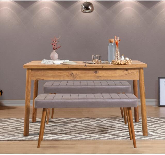 Alakítsa át étkezőjét egy kényelmes és hívogató térséggé az Extendable Dining Table & Bench Set készletünkkel. Ez a 3 darabos szett arra lett tervezve, hogy a családokat és barátokat összehozza, felejthetetlen emlékeket teremtve az asztal körül. Elegáns dizájn minden otthonhozA 100%-ban melamin bevonatú forgácslapból készült étkezőszett nemcsak tartós, hanem stílusos is. Az Atlanti fenyő és szürke színek egy csipetnyi kifinomultságot adnak bármely étkezőhöz, így tökéletes kiegészítője otthoni dekorációnak. Rugalmasság és funkcionalitásAz étkezőasztal könnyedén meghosszabbítható, hogy több vendéget fogadhasson, lehetővé téve, hogy mindenki kényelmesen üljön és együtt élvezze az étkezést. A hozzá illő padok további ülőhelyeket biztosítanak, miközben maximalizálják a helyet az étkezőben. Teremtsen tartós emlékeketAkár vacsorát rendez, akár egy laza étkezést élvez a szeretteivel, ez az étkezőszett biztosan fokozza az étkezési élményt. Masszív felépítése és időtlen dizájnja miatt elengedhetetlen darab minden otthonban. Műszaki részletek: Anyag: 100% melamin bevonatú forgácslap Vastagság: 18 mm Étkezőasztal mérete: Szélesség: 120 cm, Magasság: 75 cm, Mélység: 75 cm (1 darab) Nyitott asztal mérete: Szélesség: 155 cm, Magasság: 75 cm, Mélység: 75 cm Pad mérete: Szélesség: 100 cm, Magasság: 48 cm, Mélység: 39 cm (2 darab) Szín: Atlanti fenyő és szürke