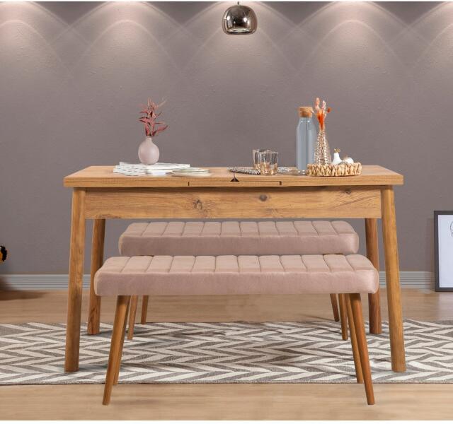 Alakítsa át étkezőjét egy stílusos és funkcionális térré az Extendable Dining Table & Bench Set készletünkkel. Ez a 3 darabos szett arra lett tervezve, hogy melegséget és eleganciát hozzon otthonába, így minden étkezés különleges alkalommá válik. Elegáns dizájn minden otthonbaA 100%-ban melamin bevonatú forgácslapból készült étkezőszett nemcsak tartós, hanem könnyen tisztítható és karbantartható is. Az Atlanti fenyő és kő színek egy csipetnyi kifinomultságot adnak bármely helyiséghez, míg a letisztult dizájn különböző dekorációs stílusokhoz illeszkedik. Rugalmasság és praktikusságAz étkezőasztal szélessége 120 cm, és 155 cm-re bővíthető, elegendő helyet biztosítva családi összejövetelekhez vagy vacsora partikhoz. A hozzá illő padok tökéletesek a vendégek kényelmes ülésére, barátságos és hívogató légkört teremtve az étkezőben. Teremtsen tartós emlékeketAkár egy laza reggelit élvez a családjával, akár egy formális vacsorát rendez, ez az étkezőszett biztosan lenyűgöz. Masszív felépítése és időtlen dizájnja sokoldalú kiegészítővé teszi bármely otthonban, létrehozva egy teret, ahol emlékek születnek és osztoznak. Műszaki részletek: Anyag: 100% melamin bevonatú forgácslap Vastagság: 18 mm Étkezőasztal mérete: Szélesség: 120 cm, Magasság: 75 cm, Mélység: 75 cm (1 darab) Nyitott asztal mérete: Szélesség: 155 cm, Magasság: 75 cm, Mélység: 75 cm Pad: Szélesség: 100 cm, Magasság: 48 cm, Mélység: 39 cm (2 darab) Szín: Atlanti fenyő és kő