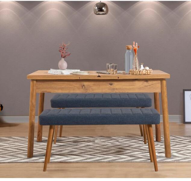 Alakítsa át étkezőjét egy kényelmes és hívogató menedékké az Extendable Dining Table & Bench Set segítségével. 100%-ban melamin bevonatú forgácslapból készült, ez a szett tartósságot és stílust sugároz. Elegáns dizájn minden otthonba Az Atlantic Pine és Sötétkék színek egy csipetnyi kifinomultságot adnak bármely helyiséghez. Az állítható étkezőasztal lehetővé teszi a rugalmas üléselrendezéseket, így tökéletes intim vacsorákhoz vagy élénk összejövetelekhez barátokkal és családdal. Teremtsen tartós emlékeket Képzelje el a nevetést és örömöt, amelyet ezen a gyönyörű étkezőszetten osztanak meg. Legyen szó egy laza brunchról vagy egy formális vacsoráról, ez a szett tökéletes hátteret biztosít a felejthetetlen emlékek megteremtéséhez. Minőségi kivitelezés A 18 mm vastagságú forgácslap biztosítja a szilárdságot és a tartósságot, míg a letisztult dizájn modern érintést ad otthona dekorációjához. A padok további ülőhelyeket kínálnak anélkül, hogy a stílust feláldoznák. Műszaki részletek: