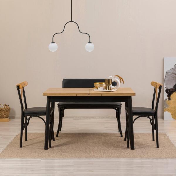 Transformálja étkezőterét eleganciával és funkcionalitássalBemutatjuk kiváló, kihúzható étkezőasztal és székek készletünket, amely a stílus és a praktikum tökéletes ötvözete. Emelje fel étkezési élményét ezzel a lenyűgöző készlettel, amelytől vendégei elámulnak majd. Páratlan minőség és tartósság100% melaminbevonatú forgácslapból készült, ez az étkezőgarnitúra tartósan készült. A masszív konstrukció biztosítja a stabilitást és a hosszú élettartamot, így hosszú évekre bölcs befektetés lesz. Fényűző kényelemKényeztesse magát a 100% műbőr anyaggal kárpitozott székeinkkel. Merüljön el a plüss párnákban, és élvezze a pihenés óráit étkezés vagy szórakozás közben. Változatos és bővíthetőKiterjeszthető kialakításának köszönhetően ez az étkezőasztal könnyedén alkalmazkodik az Ön igényeihez. Könnyedén befogadhat több vendéget, ha egyszerűen kibővíti az asztalt teljes méretére. Tökéletes a meghitt vacsorákhoz vagy nagy összejövetelekhez, ez a készlet olyan sokoldalúságot kínál, mint senki más. Kényes és időtlen designAz elegáns fekete szín kifinomultságot kölcsönöz minden étkezőhelyiségnek. Időtlen dizájnja zökkenőmentesen illeszkedik bármilyen dekorációhoz, így sokoldalúan kiegészíti otthonát. Technikai részletek: Anyag: 100% melamin bevonatú forgácslap Vastagság: 18 cm Anyag: 100% műbőr Asztal mérete: Szélesség: 120 cm, Magasság: 75 cm, Mélység: 75 cm. Nyitott asztali méret: Szélesség: 155 cm, Magasság: 75 cm, Mélység: 75 cm Székméret: Szélesség: 46 cm, Magasság: 87 cm, Mélység: 48 cm Bankméret: Szélesség: 100 cm, Magasság: 86 cm, Mélység: 41 cm Szín: Fekete