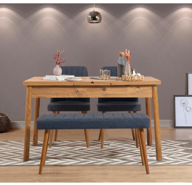 Tapasztalja meg a modernitás és a rusztikus varázsa tökéletes keverékét a kibővíthető étkezőasztalunkkal és székekkel. Készítsen tartós emlékeket szeretteivel ennek a gyönyörűen megtervezett étkezési szett körül. 100% melaminnal bevont részecskeszkával készítve ez a készlet nemcsak tartós, hanem könnyen tisztítható és karbantartható is. A fából készült lábak az elegancia és a kifinomultság hozzáadása az általános kialakításhoz. Az étkezőasztal kibővíthető, hogy több vendég befogadására kerüljön, így tökéletes a vacsorák és az összejövetelek rendezéséhez. A székeket és a padot erős fémkerettel készítik, és 100% -os vászonhab szövetben kárpitozva, kényelmet és stílust biztosítva. Az Atlanti -óceán fenyője és a sötétkék színes kombináció frissítő és kortárs megjelenést ad minden étkezőhelyhez. Frissítse étkezési területét ezzel a modern, újdonsággal, rusztikus és skandináv ihletéssel. Műszaki információk: