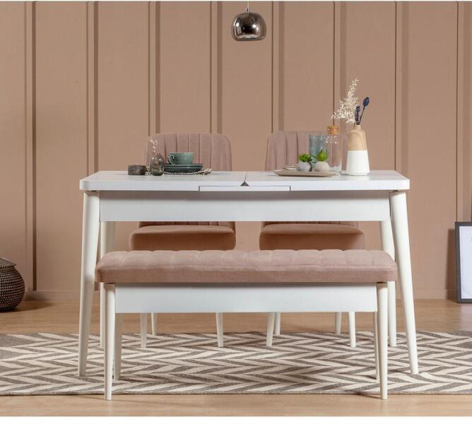Alakítsa át étkezőjét egy luxus és stílusos térré gyönyörű, kihúzható étkezőasztalunk és székek készletével. 100%-ban melamin bevonatú forgácslapból készült, és gyertyán lábakkal rendelkezik, ez a készlet nemcsak tartós, hanem eleganciát is kölcsönöz otthonának. Elegancia és Funkcionalitás ÖtvözveAz étkezőasztal letisztult dizájnnal büszkélkedik, szélessége 130 cm, magassága 77 cm, mélysége 80 cm. Teljesen kihúzva 165 cm széles, így tökéletes vacsora partik vagy családi összejövetelek lebonyolítására. A székek és a pad 100%-os bársonyszövetből készült, amely kényelmet és kifinomultságot biztosít. Modern és Elegáns DizájnA fehér és kő színek kombinációja modern és újszerű megjelenést kölcsönöz ennek a készletnek, amely bármilyen dekorációs stílust kiegészít. Az asztal 18 mm-es vastagsága biztosítja a szilárdságot, míg a tárolóegység kényelmet és praktikusságot kínál. Műszaki Részletek: Anyag: 100% melamin bevonatú forgácslap Szövet anyag: 100% bársony Vastagság: 18 mm Gyertyán lábak Étkezőasztal mérete: Szélesség: 130 cm, Magasság: 77 cm, Mélység: 80 cm (1 db) Kihúzott asztal mérete: Szélesség: 165 cm, Magasság: 75 cm, Mélység: 80 cm Szék mérete: Szélesség: 46 cm, Magasság: 85 cm, Mélység: 46 cm (2 db) Ülőmagasság: 45 cm Pad mérete: Szélesség: 110 cm, Magasság: 51 cm, Mélység: 40 cm (1 db) Tárolóegység mérete: Szélesség: 95 cm, Magasság: 12 cm, Mélység: 27 cm Ülőmagasság: 51 cm Frissítse étkezési élményét kihúzható étkezőasztalunk és székek készletével, és hozzon létre felejthetetlen emlékeket szeretteivel. Rendeljen most, és emelje otthona dekorációját új magasságokba!
