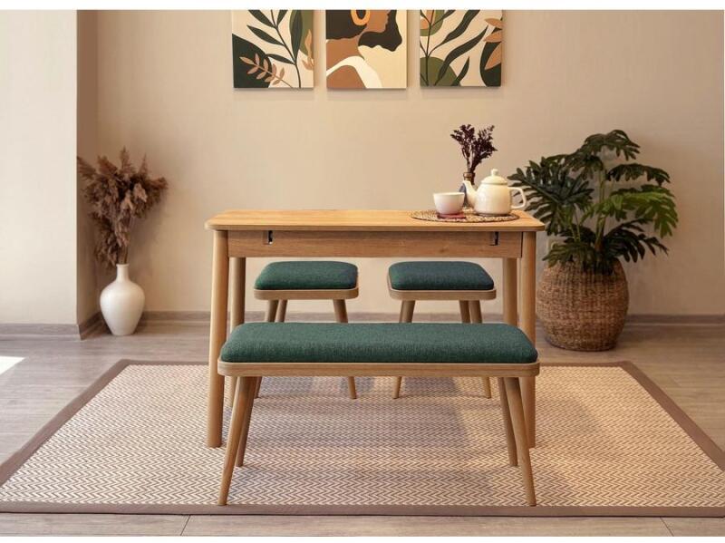 Alakítsa át étkezőjét stílusos és funkcionális térré a kihúzható étkezőasztal és székek készlettel. Ez a 4 darabos készlet tökéletesen alkalmas kis helyiségekbe, sokoldalúságot és kényelmet kínál anélkül, hogy kompromisszumot kötne a stílusban. Elegáns design a modern élethez Ennek az étkezőgarnitúrának az elegáns és modern kialakítása feldobja otthona megjelenését. A tölgy és a zöld színek kombinációja kifinomultságot kölcsönöz bármely helyiségnek, így tökéletes kiegészítője lesz az otthoni dekorációnak. Térkímélő és bővíthető Kompakt méretének köszönhetően ez az étkezőasztal ideális lakásokba vagy kisebb étkezőhelyiségekbe. Az asztal könnyedén meghosszabbítható, hogy több vendéget tudjon fogadni, így tökéletes vacsoraestek vagy családi összejövetelek megrendezéséhez. Kényelmes ülőhely A készlet két széket és egy padot tartalmaz, így bőséges ülőhelyet biztosít vendégei számára. A székeket és a padot a kényelem érdekében tervezték, tökéletes magassággal az étkezéshez és a pihenéshez. Tartósság és kiváló minőség Ez az étkezőgarnitúra 100% melaminbevonatú forgácslapból készült, így hosszú élettartamra készült. A 18 mm-es vastagság biztosítja a tartósságot és a stabilitást, így évekig élvezheti étkezőgarnitúráját. Technikai részletek: