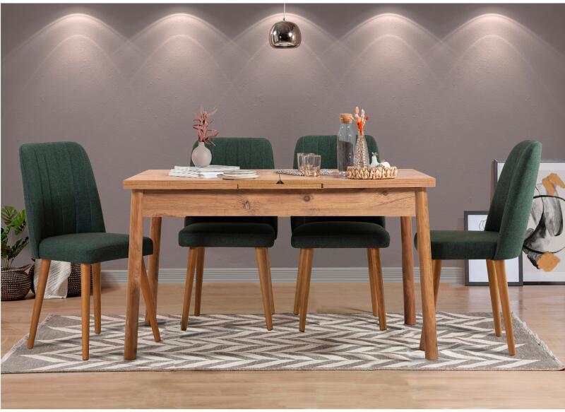 Alakítsa át étkezőjét lenyűgöző térré a gyönyörű, kihúzható étkezőasztal és székek készlettel. A szenvedéllyel és precizitással készített 5 darabos készletet úgy terveztük, hogy emelje az étkezési élményt, és maradandó emlékeket teremtsen szeretteivel. Felszabadítja a természet szépségétA 100% melaminbevonatú forgácslap biztosítja a tartósságot és a hosszú élettartamot, míg a falábak eleganciát és melegséget kölcsönöznek a térnek. Az atlanti fenyő színe a természet szépségét hozza el otthonába, nyugodt és hívogató légkört teremtve. Változatos és bővíthetőKiterjeszthető kialakításának köszönhetően étkezőasztalunk könnyedén alkalmazkodik az Ön igényeihez. Akár egy meghitt vacsorát, akár egy ünnepi összejövetelt rendez, egyszerűen nyissa ki az asztalt teljes 153 cm-es szélességére, és mindenki könnyedén elfér. Páratlan kényelem és stílusA stabil fémből készült székkeretek stabilitást és tartást biztosítanak, míg a 100% lenvászon habszivacs szövet páratlan kényelmet nyújt. A rusztikus zöld szín frissességet kölcsönöz, és tökéletesen kiegészíti az atlanti fenyőfát, harmonikus és stílusos együttest alkotva. Technikai részletek: Vastagság: 18 mm Étkezőasztal méretei: Szélesség: 120 cm, Magasság: 77 cm, Mélység: 75 cm. Nyitott asztal méretei: Szélesség: 153 cm, Magasság: 75 cm, Mélység: 75 cm Székváz: Székváz: 1,5 cm: Fém Székszövet: 100% vászon hab Szék méretei: Szélesség: 47 cm, Magasság: 90 cm. Szék ülésmagassága: 49 cm Szín: atlanti fenyő és zöld Fogadja el ennek az étkezőgarnitúrának a modern, újszerű, rusztikus, skandináv és vidéki ihletésű koncepcióját, és hozzon létre egy olyan teret, amely tükrözi az Ön egyedi stílusát. Emelje fel étkezési élményét, és tegyen nyilatkozatot a kihúzható étkezőasztal és székek készlettel.