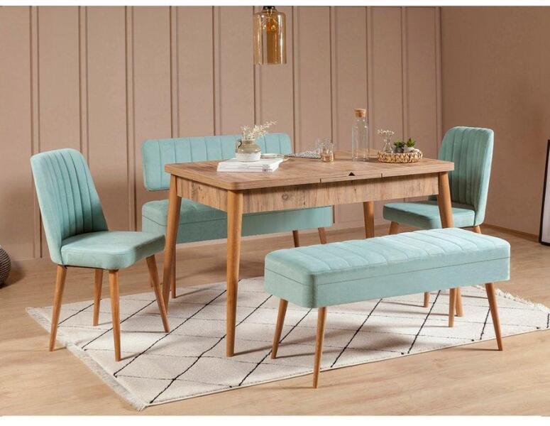 Változtassa meg étkezőhelyiségét az elegáns és sokoldalú, kihúzható étkezőasztal és székek készlettel Teremtsen felejthetetlen emlékeket szeretteivel e lenyűgöző, kihúzható étkezőasztal és székek szettje körül. A 100% melaminbevonatú forgácslapból készült készlet nemcsak tartós, hanem kifinomultságot és stílust is sugároz. Növelje az étkezési élményt A kihúzható étkezőasztal könnyedén alkalmazkodik az Ön igényeihez, így több vendéget tud fogadni, és meleg és hívogató légkört teremthet. Atlanti fenyőfa kivitelével természetes szépséget kölcsönöz helyiségének, míg a pisztáciazöld székek és pad színpompát és élénkséget kölcsönöznek. Páratlan kényelem és tartósság Kényeztesse magát a 100% bársonyszövetből készült székek fényűző kényelmével, amelyeket úgy terveztek, hogy maximális alátámasztást és pihenést biztosítsanak étkezései során. Az asztal és a székek masszív szerkezete hosszú élettartamot biztosít, így ez a készlet hosszú évekre szóló bölcs befektetés. Technikai részletek: