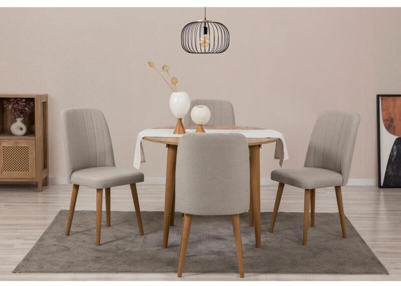 Változtassa meg étkezőjét ezzel a gyönyörű, kihúzható étkezőasztal és székek készlettel! Tapasztalja meg a stílus és a funkcionalitás tökéletes ötvözetét ezzel a lenyűgöző, 5 darabos étkezőgarnitúrával. A legnagyobb precizitással készült készletet úgy tervezték, hogy emelje az étkezési élményt, és meleg és hívogató légkört teremtsen otthonában. Páratlan tartósság és elegancia A 100% melaminbevonatú forgácslapból készült étkezőgarnitúra kivételes tartósságot biztosít, így hosszú távú befektetés lesz otthonában. A 18 mm-es vastagság hozzájárul a szilárdságához, így biztosítva, hogy kiállja az idő próbáját. A falábak eleganciát kölcsönöznek, rusztikus bájt kölcsönözve étkezőhelyének. Változatos és bővíthető kialakítás A kihúzható asztallal rendelkező készlet sokoldalúságot kínál, hogy alkalmazkodni tudjon a változó igényekhez. Az asztal könnyedén 100 cm-ről 139 cm-re bővíthető, így nagyobb összejöveteleket is kényelmesen rendezhet, vagy élvezheti a meghitt étkezéseket szeretteivel. Élvezze a rugalmasságot és az alkalmazkodóképességet, amelyet ez a készlet az étkezőjébe hoz. Esztétikai vonzerő és kényelem Az atlanti fenyő és a krémszínű színek kombinációja vizuálisan vonzó kontrasztot teremt, ami kifinomultságot kölcsönöz étkezőterének. A székek ergonomikus kialakításukkal optimális kényelmet és alátámasztást biztosítanak, így Ön és vendégei órákon át élvezettel elmerülhetnek kellemes beszélgetésekben az étkezések közben. Technikai részletek: