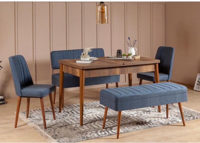 Hozzon létre maradandó emlékeket a kihúzható étkezőasztal és székek készlettel Tegyen minden étkezést különleges eseménnyé lenyűgöző kihúzható étkezőasztal és székkészletünkkel. A 100% melaminbevonatú forgácslapból készült készlet nemcsak tartós, hanem eleganciát és kifinomultságot is sugároz. Növelje az étkezési élményt Elegáns kialakításával és gyönyörű diófa és sötétkék színkombinációjával étkezőgarnitúránk azonnal stílusos paradicsommá varázsolja étkezőhelyét. A kihúzható asztal lehetővé teszi, hogy több vendéget fogadjon, így tökéletes a meghitt vacsorákhoz vagy nagyobb összejövetelekhez. Páratlan kényelem és minőség A készlethez tartozó székeket és padot az Ön kényelmét szem előtt tartva terveztük. A 100%-os vászonszövet egy kis luxust kölcsönöz, míg a nagyvonalú ülésmagasság optimális alátámasztást biztosít. Akár egy nyugodt reggeli, akár egy vacsoraparti házigazdája, étkezőgarnitúránk páratlan kényelmet és minőséget biztosít. Technikai részletek: