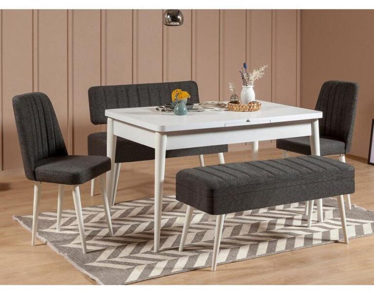 Hozzon létre maradandó emlékeket a kihúzható étkezőasztal és székek készlettel Tegyen minden étkezést különleges eseménnyé elegáns és sokoldalúan használható, kihúzható étkezőasztal és székek készletünkkel. A szeretettel és a részletekre való odafigyeléssel készített 5 darabos készletet úgy terveztük, hogy maradandó emlékeket teremtsen szeretteivel. Növelje az étkezési élményt Elegáns és modern kialakításával étkezőasztalkészletünk kifinomultságot kölcsönöz bármely helyiségnek. A kihúzható funkciónak köszönhetően könnyedén elférnek rajta plusz vendégek, így mindenki úgy érezheti, hogy szívesen látják és bevonják. Páratlan minőség és tartósság A 100% melaminbevonatú forgácslapból készült étkezőasztalkészletünk úgy készült, hogy kiállja az idő próbáját. A masszív konstrukció biztosítja a stabilitást és a tartósságot, így hosszú távú befektetés lesz az Ön otthonában. Kényelem és stílus kombinálva A készlethez tartozó székeket és padot a kényelem és a stílus jegyében terveztük. A 100%-os vászon szövetkárpitozás egy kis luxust kölcsönöz, míg az ergonomikus kialakítás optimális alátámasztást biztosít a kényelmes ülőalkalmatosságok órákon át tartó használatához. Technikai részletek: