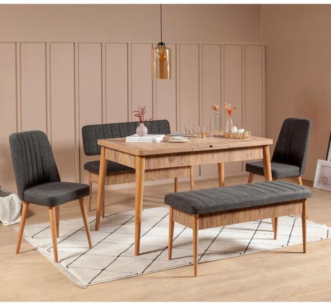 Alakítsa át étkezőjét egy kényelmes és hívogató hellyé az Extendable Dining Table & Chairs Set segítségével. 100%-ban melamin bevonatú forgácslapból készült, és gyertyán lábakkal rendelkezik, ez a szett nemcsak tartós, hanem stílusos is. A 100%-os lenvászon anyag eleganciát kölcsönöz a szettnek, így tökéletes mindennapi étkezésekhez, mind pedig formális összejövetelekhez. Elegáns dizájn minden otthonba Az étkezőasztal letisztult dizájnnal büszkélkedhet, szélessége 130 cm, magassága 77 cm, mélysége 80 cm. Teljesen kinyitva 165 cm szélességet ér el, elegendő helyet biztosít a család és barátok számára. A székek és a pad kényelmes ülést kínálnak modern érintéssel, míg a tárolóegység funkciót ad a szetthez. Modern, mégis időtlen Az Atlantic Pine és Anthracite színek modern, mégis időtlen vonzerőt kölcsönöznek ennek a szettnek, így sokoldalú kiegészítője bármilyen otthoni dekorációnak. Akár rusztikus, skandináv, vagy újdonság stílust kedvel, ez a szett könnyedén kiegészíti esztétikáját. Műszaki részletek: