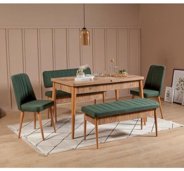 Alakítsa át étkezőjét egy kényelmes és hívogató hellyé az Extendable Dining Table & Chairs Set segítségével. 100%-ban melamin bevonatú forgácslapból és lenvászonból készült, ez a szett a minőséget és tartósságot sugározza. A gyertyán lábak eleganciát kölcsönöznek, így tökéletes kiegészítője bármely otthonnak. Elegáns dizájn minden otthonhoz Az étkezőasztal nemcsak stílusos, hanem funkcionális is, kinyitható funkcióval rendelkezik, amely lehetővé teszi, hogy több vendéget fogadjon. A székek és a pad kényelmes ülést biztosítanak órákon át tartó étkezésekhez és beszélgetésekhez. A tárolóegység kényelmet és rendezettséget ad a térhez. Teremtsen emlékezetes pillanatokat Képzelje el, ahogy szeretteivel körbeülnek ezen a gyönyörű étkezőszetten, megosztva az étkezéseket és tartós emlékeket teremtve. Az Atlanti fenyő és zöld színek melegséget és bájt adnak étkezőjének, barátságos légkört teremtve mindenki számára. Műszaki részletek: