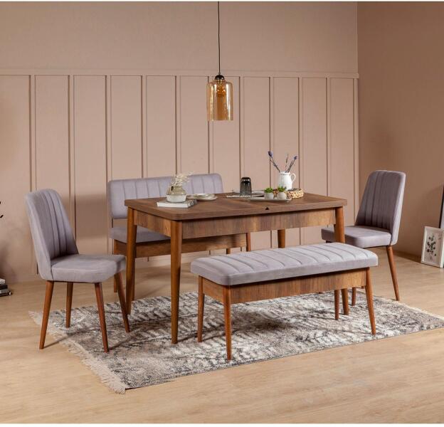 Alakítsa át étkezőjét egy luxus menedékké gyönyörű, kihúzható étkezőasztalunk és székek készletével. 100%-ban melamin bevonatú forgácslapból és bársonyos szövetből készült, ez a készlet eleganciát és kifinomultságot sugároz. A 18 mm-es vastagság és a gyertyán lábak tartósságot és stabilitást biztosítanak, így időtlen kiegészítője lesz otthonának. Elegancia és Funkcionalitás ÖtvözveAz étkezőasztal letisztult dizájnnal rendelkezik, méretei 130 cm x 77 cm x 80 cm, amely 165 cm-re bővíthető nagyobb összejövetelekhez. A székek és a pad kényelmes ülést biztosítanak, méreteik 47 cm x 89 cm x 46 cm és 110 cm x 48 cm x 40 cm. A tárolóegység praktikus, méretei 95 cm x 12 cm x 27 cm, tökéletes az étkezési alapvető dolgok rendezett tárolásához. Modern, mégis Időtlen DizájnA dió és Soho színek modernitást adnak a készletnek, miközben megőrzik a hagyomány érzését. Akár rusztikus, akár skandináv, akár vidéki stílusban gondolkodik, ez a készlet zökkenőmentesen illeszkedik bármilyen dekorációhoz, emelve az étkezője hangulatát. Emelje étkezési élményét a kihúzható étkezőasztalunk és székek készletével, amely a stílus és a funkcionalitás tökéletes kombinációja. Rendelje meg most, és hozzon létre felejthetetlen emlékeket szeretteivel ezzel a lenyűgöző étkező készlettel.