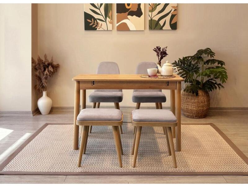 Alakítsa át étkezőjét egy stílusos és hívogató térséggé az Extendable Dining Table & Chairs Set segítségével. Ez az 5 darabos szett arra lett tervezve, hogy melegséget és eleganciát hozzon otthonába, így minden étkezés különleges alkalommá válik. Elegáns dizájn minden otthonba A tölgy és a Soho szürke színek kombinációja egy csipetnyi kifinomultságot ad bármilyen dekorációhoz, míg a letisztult vonalak és modern dizájn sokoldalú kiegészítővé teszi ezt a szettet az étkezőjében. Funkcionális és praktikus A kihúzható étkezőasztal lehetővé teszi, hogy könnyedén elhelyezzen extra vendégeket, míg a kényelmes székek és puffok elegendő ülőhelyet biztosítanak mindenki számára. A 100%-ban melamin bevonatú forgácslap tartósságot és könnyű karbantartást garantál, így ez a szett praktikus választás a mindennapi használatra. Teremtsen emlékezetes pillanatokat Akár vacsora partit rendez, akár egy csendes étkezést élvez a családjával, ez az étkező szett tökéletes környezetet teremt az emlékezetes pillanatokhoz. A masszív kivitelezés és időtlen dizájn biztosítja, hogy évekig élvezhesse ezt a szettet. Műszaki részletek: