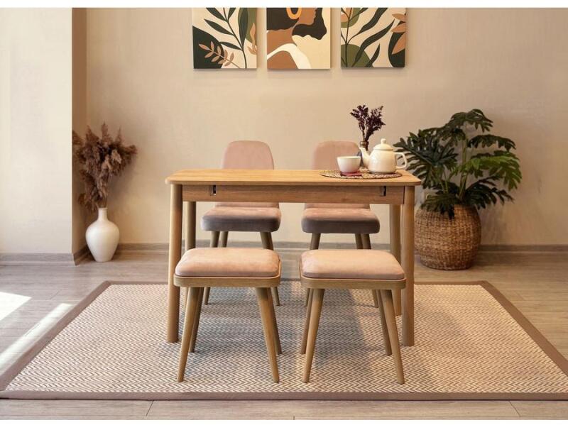 Alakítsa át étkezőjét stílusos és funkcionális térré a kihúzható étkezőasztal és székek készlettel. Ez az 5 darabos készlet tökéletes azok számára, akik szeretnek vendégül látni vagy együtt élvezni a családi étkezéseket. Elegáns design : a tölgyfa és a kő színek kombinációja modern és kifinomult megjelenést kölcsönöz ennek a készletnek, amely bármilyen dekorációs stílust kiegészít. A letisztult vonalak és a letisztult design időtálló kiegészítője lesz otthonának. Változatos funkcionalitás : a kihúzható étkezőasztal lehetővé teszi, hogy szükség esetén könnyedén befogadjon további vendégeket, míg a kényelmes székek és zsámolyok elegendő ülőhelyet biztosítanak mindenkinek. Minőségi kivitelezés : a 100% melaminbevonatú forgácslapból készült készlet tartós, és úgy épült, hogy évekig kitartson. A 18 mm-es vastagság növeli a masszivitást és a stabilitást. Technikai részletek