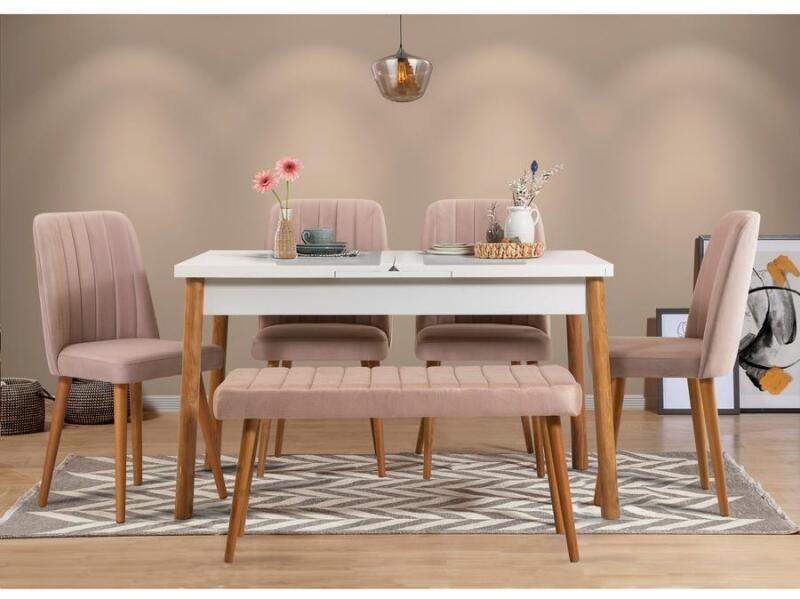 Tapasztalja meg az elegancia és a funkcionalitás tökéletes keverékét a kihúzható étkezőasztal és székek szettünkkel Engedje át magát a skandináv design szépségének a kiváló kihúzható étkezőasztal és székek készletünkkel. A legnagyobb precizitással készült készlet biztosan feldobja étkezési élményét, és egy csipetnyi kifinomultságot kölcsönöz otthonának. Páratlan minőség és tartósság A 18 mm vastagságú, 100% melaminbevonatú forgácslapból készült étkezőasztal- és székkészletünk időtálló. A falábak stabil támasztékot biztosítanak, így garantálva a stabilitást és a hosszú élettartamot. Változatos és bővíthető Kiterjeszthető kialakításának köszönhetően étkezőasztalunk könnyedén átalakul a kompakt 120 cm-es szélességből 153 cm szélesre, így több vendéget tud befogadni és tágas étkezőhelyet hoz létre. A 75 cm-es nyitott asztalmagasság egy csipetnyi pompát kölcsönöz étkezőhelyének. Fényűző kényelem A székeket és a padot fémvázzal tervezték, és 100% bársony habszivacs anyaggal kárpitozták, így plüss és kényelmes ülőalkalmatosságot biztosítanak. A szék 49 cm-es ülésmagassága mindenki számára optimális kényelmet biztosít. Stílusos és modern Az atlanti fenyő, a fehér és a kő színek gyönyörű kombinációjával étkezőgarnitúránk modern és elegáns hangulatot áraszt. Könnyedén kiegészít bármilyen belsőépítészeti dekorációt, és eleganciát kölcsönöz étkezőjének. Technikai részletek: