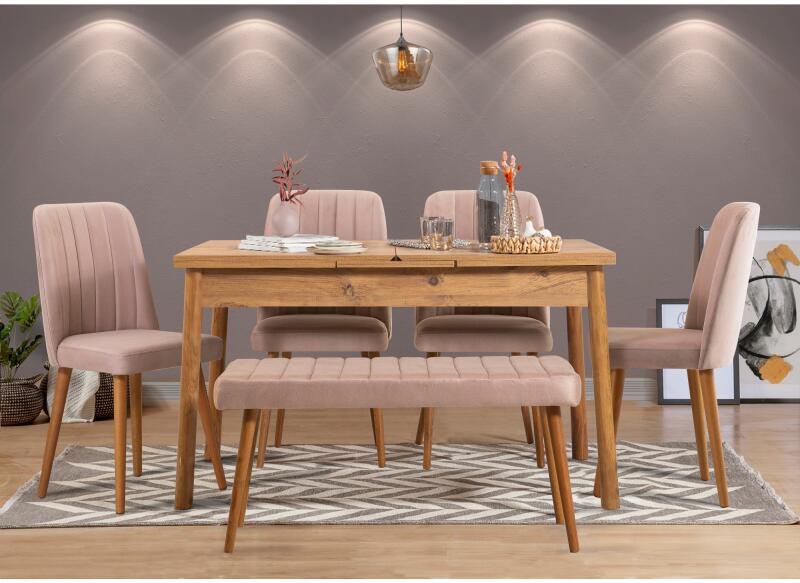 Változtassa meg étkezőterét a gyönyörű, kihúzható étkezőasztal és székek készlettel!Teremtsen meleg és hívogató hangulatot otthonában ezzel a lenyűgöző, 6 darabos étkezőgarnitúrával. A 100% melaminbevonatú forgácslapból készült készlet nemcsak tartós, hanem elegáns megjelenést is kölcsönöz bármely helyiségnek. Az asztal falábai, valamint a székek és a pad fémkeretei stabilitást és szilárdságot biztosítanak, így hosszú évekig használhatóak. Tapasztalja meg a stílus és a funkcionalitás tökéletes keverékét. A 120 cm x 77 cm x 75 cm méretű étkezőasztal 153 cm-re bővíthető, így különleges alkalmak alkalmával több vendéget is fogadhat. A fényűző bársonyhabbal kárpitozott székek 49 cm-es ülésmagasságukkal a lehető legnagyobb kényelmet és támaszt nyújtják. A 100 cm x 48 cm x 39 cm méretű pad egyedi hangulatot kölcsönöz étkezőhelyének. Örökítse meg a rusztikus, skandináv és vidéki ihletésű dizájnt. A készlet atlanti fenyő és kőszínei bájos és hangulatos hangulatot teremtenek, így minden étkezés élvezetes élményt nyújt. Akár vacsorapartit rendez, akár családi ebédet tart, ez az étkezőgarnitúra biztosan lenyűgözi vendégeit, és maradandó benyomást fog hagyni. Technikai részletek: Anyag: 100% melamin bevonatú forgácslap Vastagság: 18 mm Asztali méretek: 120 cm x 77 cm x 75 cm (kibővítve: 153 cm x 75 cm x 75 cm x 75 cm) Szék váza: Fém Székszövet: 100% bársony hab Szék méretei: (ülőfelület magassága: 49 cm) Pad váza: Fém Padszövet: 100% bársony hab Pad méretei: 100 cm x 48 cm x 39 cm Szín: Atlantic fenyő és kő
