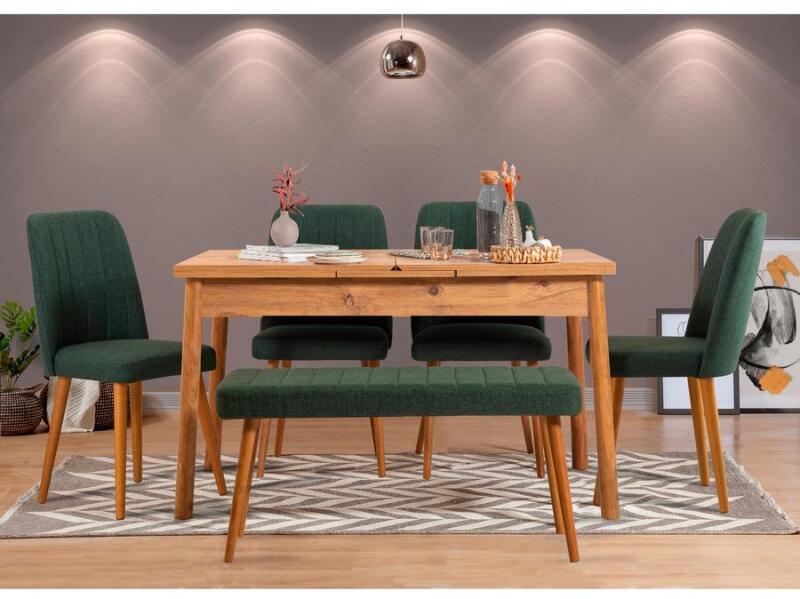 Változtassa meg étkezőhelyiségét a modern eleganciájú, kihúzható étkezőasztal és székek készletével Teremtsen maradandó emlékeket családjával és barátaival a gyönyörű kihúzható étkezőasztal és székek szettünk körül. A legnagyobb precizitással és a részletekre való odafigyeléssel készült készletet úgy terveztük, hogy új magasságokba emelje étkezési élményét. Páratlan minőség és tartósság A 18 mm vastagságú, 100% melaminbevonatú forgácslapból készült étkezőasztal és székkészletünk úgy készült, hogy kiállja az idő próbáját. A masszív falábak kiváló stabilitást biztosítanak, így biztonságosan és biztonságosan étkezhetnek Ön és szerettei. Változatos és bővíthető Kiterjeszthető kialakításának köszönhetően étkezőasztalunk könnyedén átalakul kompakt 120 cm-es szélességéről lenyűgöző 153 cm-es szélességűre, így több vendéget tud fogadni és barátságos légkört teremthet. Kényelem és stílus A székek és a pad 100%-os vászonhabszövet kárpitozásúak, plüss és kényelmes ülőalkalmatosságot biztosítva. A fémvázak egy csipetnyi modernitást kölcsönöznek, míg az atlanti fenyő és a zöld színkombináció rusztikus és skandináv bájt kölcsönöz étkezőhelyének. Technikai részletek:
