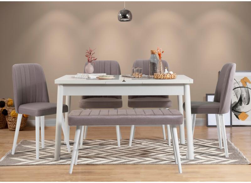 Alakítsa át étkezőjét egy kényelmes és stílusos hellyé az Extendable Dining Table & Chairs Set segítségével. 100%-ban melamin bevonatú forgácslapból és fa lábakból készült, ez a szett a minőséget és tartósságot sugározza. A letisztult dizájn és a semleges fehér és szürke színpaletta tökéletes kiegészítője bármely modern otthonnak. Elegáns és Funkcionális DizájnAz étkezőasztal kompakt mérete 120 cm szélesség, 77 cm magasság és 75 cm mélység, tökéletes intim összejövetelekhez. Kinyitva 153 cm szélességre bővül, elegendő helyet biztosít nagyobb vacsorákhoz. A székek és a pad, luxus bársonyos habbal kárpitozva, kényelmet és kifinomultságot kínál. A fém keretek biztosítják a stabilitást és a tartósságot. Teremtsen Emlékezetes PillanatokatKépzelje el, hogy családi vacsorákat vagy barátok szórakoztatását rendezi e lenyűgöző étkezőszett körül. A skandináv ihletésű dizájn eleganciát ad a térnek, meleg és hívogató légkört teremtve. Akár egy laza étkezést élvez, akár különleges alkalmakat ünnepel, ez a szett az étkezője középpontjában áll majd. Műszaki Részletek: Anyag: 100% melamin bevonatú forgácslap Vastagság: 18 mm Szék Keret: Fém Szék Anyag: 100% bársonyos hab Szék Méretek: 47 cm szélesség, 90 cm magasság, 49 cm ülésmagasság Pad Keret: Fém Pad Anyag: 100% bársonyos hab Pad Méretek: 100 cm szélesség, 48 cm magasság, 39 cm mélység Szín: Fehér és Szürke Frissítse étkezési élményét az Extendable Dining Table & Chairs Set segítségével. Ölelje át a skandináv dizájn szépségét, és teremtsen felejthetetlen emlékeket szeretteivel. Rendelje meg most, és emelje új magasságokba otthona dekorációját.