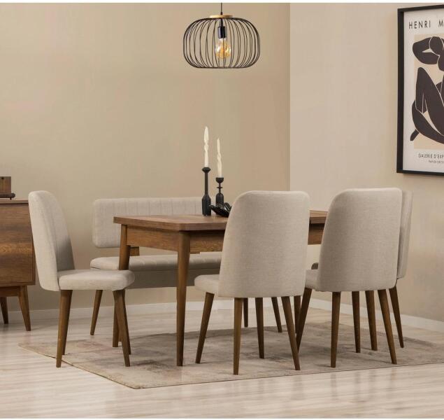 Alakítsa át étkezőjét egy stílusos és hívogató hellyé az Extendable Dining Table & Chairs Set készletünkkel. A 100%-ban melamin bevonatú forgácslapból készült készlet nemcsak tartós, hanem eleganciát és kifinomultságot is sugároz. A gyertyán lábak egy kis bájt adnak hozzá, így ez a készlet tökéletes kiegészítője bármely otthonnak. Elegáns dizájn az otthonáhozAz étkezőasztal letisztult dizájnnal rendelkezik, dió és krém színkombinációval, amely modern és stílusos megjelenést kölcsönöz. A kihúzható funkció lehetővé teszi, hogy könnyedén több vendéget fogadjon, így ideális családi összejövetelekhez vagy vacsora partikhoz. A székekhez használt lenvászon anyag egy kis luxust és kényelmet ad, biztosítva, hogy vendégei stílusosan üljenek. Funkcionális és praktikusA készlet 4 széket, egy padot és egy tárolóegységet tartalmaz, elegendő ülőhelyet és tárolási lehetőséget biztosítva az étkezőjéhez. Az asztal 18 mm-es vastagsága stabilitást és tartósságot garantál, míg a székek és a pad ülésmagassága a maximális kényelem érdekében van tervezve. Műszaki részletek: Anyag: 100% melamin bevonatú forgácslap Szövet anyag: 100% len Vastagság: 18 mm Gyertyán lábak Étkezőasztal mérete: Szélesség: 130 cm, Magasság: 76 cm, Mélység: 80 cm (1 db) Kihúzott asztal mérete: Szélesség: 165 cm, Magasság: 76 cm, Mélység: 80 cm Szék mérete: Szélesség: 47 cm, Magasság: 90 cm, Mélység: 46 cm (4 db) Ülésmagasság: 49 cm Pad mérete: Szélesség: 110 cm, Magasság: 82,5 cm, Mélység: 47 cm (1 db) Tárolóegység mérete: Szélesség: 95 cm, Magasság: 12 cm, Mélység: 27 cm Ülésmagasság: 51 cm Szín: Dió és krém