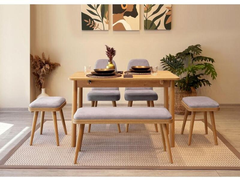 Alakítsa át étkezőjét egy stílusos és hívogató hellyé az Extendable Dining Table & Chairs Set készletünkkel. Ez a 6 darabos készlet arra lett tervezve, hogy a családokat összehozza, és emlékezetes pillanatokat teremtsen az étkezőasztal körül. Elegáns Design : A sima tölgy és Soho szürke színek modern érintést adnak bármilyen étkező dekorációhoz, míg a 18 mm vastag, 100% melamin bevonatú forgácslap tartósságot és hosszú élettartamot biztosít. Rugalmas Funkcionalitás : Az állítható étkezőasztal könnyedén elfér extra vendégek számára, nyitott mérete 110 cm x 75 cm x 70 cm, míg a székek, puffok és pad kényelmes ülőhelyet biztosítanak mindenki számára. Kényelmes Ülés : A székek és puffok tökéletes méretekkel rendelkeznek az optimális kényelem érdekében, az ülés magassága 40 cm, az ülés mélysége 43,5 cm. Ne hagyja ki a lehetőséget, hogy emelje étkezési élményét ezzel a kiváló étkező készlettel. Rendeljen most, és teremtsen felejthetetlen pillanatokat szeretteivel. Műszaki Részletek: