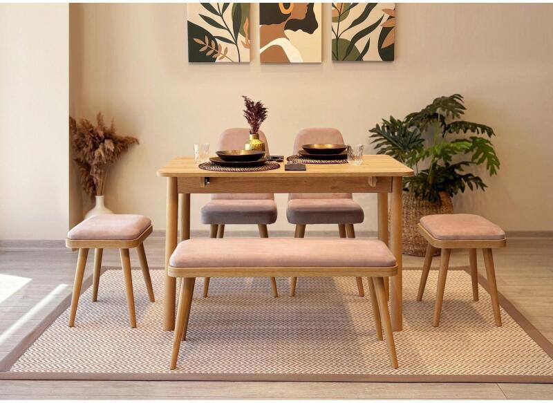 Alakítsa át étkezőjét elegancia és kifinomultság terévé az Extendable Dining Table & Chairs Set segítségével. Ez a 6 darabos szett úgy lett tervezve, hogy stílust és funkcionalitást hozzon otthonába, így minden étkezés különleges alkalommá válik. Elegáns dizájn az otthonáhozAz étkezőasztal letisztult és modern dizájnnal rendelkezik, melamin bevonatú forgácslap konstrukciója pedig tartós és könnyen tisztítható. A szett 2 széket, 2 puffot és 1 padot tartalmaz, mindegyik tökéletesen kiegészíti az asztalt. Teremtsen emlékeket az asztal körülGyűjtse össze családját és barátait e gyönyörű étkezőszett körül, és hozzon létre olyan emlékeket, amelyek egy életen át tartanak. Az állítható asztal lehetővé teszi, hogy több vendéget fogadjon, amikor szükséges, így tökéletes vacsora partik vagy ünnepi összejövetelek lebonyolítására. Minőségi kivitelezésPontossággal és részletekre való odafigyeléssel készült, ez az étkezőszett tartós használatra lett tervezve. A 18 mm vastagságú forgácslap stabilitást és tartósságot biztosít, míg a tölgy és kő színek melegséget adnak bármely térhez. Műszaki részletek: Anyag: 100% Melamin bevonatú forgácslap Vastagság: 18 mm Étkezőasztal mérete: Szélesség: 110 cm, Magasság: 75 cm, Mélység: 50 cm (1 darab) Nyitott asztal mérete: Szélesség: 110 cm, Magasság: 75 cm, Mélység: 70 cm Szék mérete: Szélesség: 41 cm, Magasság: 86 cm, Mélység: 38 cm (2 darab) Ülőmagasság: 40 cm, Ülőmélység: 43,5 cm Puff mérete: Szélesség: 40 cm, Magasság: 46 cm, Mélység: 33 cm (2 darab) Puff láb magassága: 38 cm Pad mérete: Szélesség: 90 cm, Magasság: 46 cm, Mélység: 33 cm (1 darab) Pad láb magassága: 38 cm Szín: Tölgy és Kő