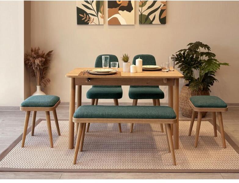 Alakítsa át étkezőjét az elegancia és a kifinomultság terévé a kihúzható étkezőasztal és székek szettünkkel. Ezt a 6 darabos készletet úgy terveztük, hogy stílust és funkcionalitást hozzon otthonába, így minden étkezés különleges alkalom lesz. Elegáns design : a tölgy és a zöld színek kombinációja egy csipetnyi modernitást kölcsönöz étkezőhelyének, meleg és hívogató légkört teremtve családja és vendégei számára. Változatos funkcionalitás : a kihúzható étkezőasztal lehetővé teszi, hogy szükség esetén könnyedén több vendéget is el tudjon fogadni, míg a székek, a zsámolyok és a pad kényelmes ülőhelyet biztosítanak mindenki számára. Minőségi kivitelezés : a 18 mm vastagságú, 100% melaminbevonatú forgácslapból készült készlet tartós és úgy épült, hogy évekig kitartson. Technikai részletek