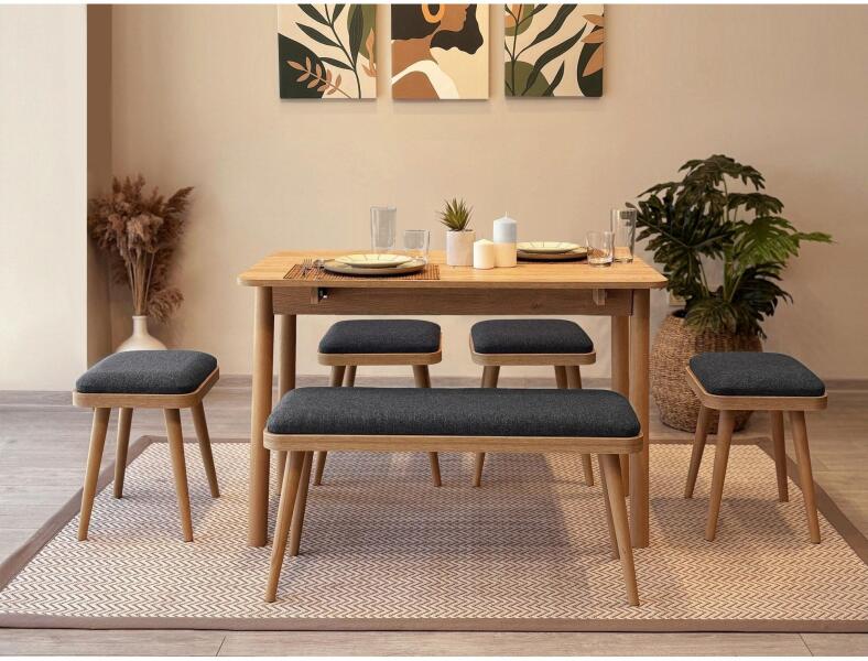 Átalakítsd étkezőjét stílusos és meghívó helyré, kibővíthető étkezőasztalunkkal és székekkel. Ez a 6 darabos készlet tökéletes családi vacsorák, ünnepi összejövetelek vagy intim ételek rendezéséhez szeretteivel. Elegáns tervezés Ennek az étkezőkészletnek a karcsú és modern kialakítása minden étkező megjelenését megemeli. A tölgy és az antracit színek kombinációja a kifinomultsághoz hozzáadja a térét, míg a 100% -os melaminnal bevont részecskeszkék építése biztosítja a tartósságot és a hosszú élettartamot. Sokoldalú és funkcionális A kibővíthető étkezőasztal lehetővé teszi, hogy szükség esetén könnyedén befogadhassa az extra vendégeket, így tökéletes mind a mindennapi használatra, mind a különleges alkalmakra. A készlet 4 székletet és 1 padot tartalmaz, amelyek mindenki számára bőséges ülőhelyeket biztosítanak. Készítsen tartós emlékeket Gyűjtsön össze ezt a gyönyörű étkezési szettet a családjával és a barátaival, és készítsen felejthetetlen emlékeket az ízletes ételek és a szívből származó beszélgetések során. A szilárd építés és a kényelmes ülőhely megkönnyíti a minőségi időtartam együttélését. Frissítse az étkezőjét ma meghosszabbítható étkezőasztalunkkal és székeinkkel, és tegye minden étkezést különleges alkalommal. Műszaki részletek: Anyag: 100% melamin bevonatú részecskeszár vastagság: 18 mm Étkezőasztal mérete: Szélesség: 110 cm, magasság: 75 cm, mélység: 50 cm (1 darab) Nyitott asztal mérete: Szélesség: 110 cm, magasság: 75 cm, mélység: 70 cm Széklet: Szélesség: 40 cm, magasság: 46 cm, mélység: 33 cm (4 darab) A széklet láb magassága: 38 cm Pad: Szélesség: 90 cm, magasság: 46 cm, mélység: 33 cm (1 darab) A pad lábmagassága: 38 cm Szín: tölgy és antracit
