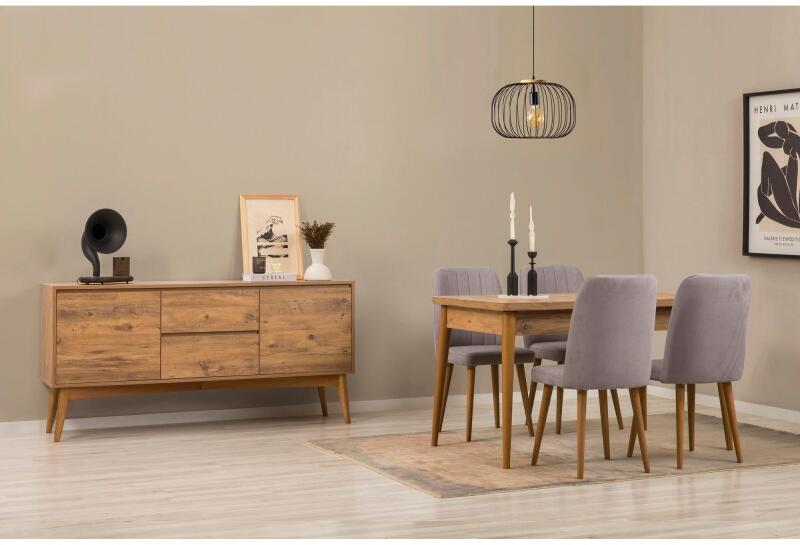 Alakítsa át étkezőjét stílusos és funkcionális térré a kihúzható étkezőasztallal, székekkel és konzolkészlettel. Ez a 6 darabos készlet tökéletes családi vacsorák megrendezésére, baráti összejövetelekre, vagy akár csak egy csendes otthoni étkezéshez. Elegáns design minden otthonbaAz atlanti fenyő és a szürke színkombináció kifinomultságot kölcsönöz bármelyik étkező dekorációnak. A kihúzható étkezőasztal lehetővé teszi, hogy szükség esetén könnyedén befogadjon több vendéget, míg a hozzá illő székek kényelmet és stílust biztosítanak. Minőségi kivitelezésA 100% melaminbevonatú forgácslapból készült készletet úgy építették, hogy évekig kitartson. A 18 mm-es vastagság biztosítja a tartósságot és a stabilitást, így megbízható választás otthonába. Hívogató légkör megteremtéseA készlethez tartozó konzol extra tárolóhelyet biztosít, és teljessé teszi étkezője megjelenését. Akár dekorációs tárgyakat állít ki, akár étkészleteket tárol, ez a konzol sokoldalúan használható kiegészítője otthonának. Technikai részletek: Szélesség: 130 cm, Magasság: 76 cm, Mélység: 80 cm (1 db). Nyitott asztali méret: Szélesség: 165 cm, Magasság: 76 cm, Mélység: 80 cm Székméret: Szélesség: 44 cm, Magasság: 90 cm, Mélység: 46 cm (4 db) Ülésmagasság: 40 cm, ülésmélység: 43. 5 cm Konzol: Szélesség: 170 cm, Magasság: 82. 5 cm, mélység: 45 cm (1 db) Konzol láb magassága: 29 cm Szín: Atlantic fenyő és szürke
