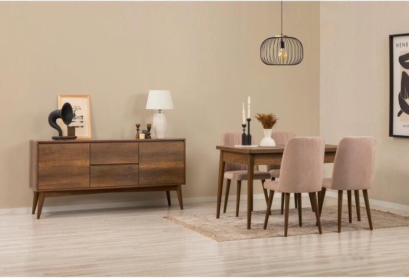 Alakítsa át étkezőjét egy stílusos és hívogató térséggé az Extendable Dining Table, Chairs & Console Set készletünkkel. Ez a 6 darabos szett eleganciát és funkcionalitást ad otthonának, így minden étkezés különleges alkalommá válik. Elegáns dizájn az otthonáhozEnnek az étkezőszettnek a letisztult és modern dizájnja azonnal feldobja étkezője megjelenését. A dió és kő színek kifinomult és időtlen esztétikát teremtenek, amely lenyűgözi vendégeit. Rugalmasság és praktikusságA kihúzható étkezőasztal lehetővé teszi, hogy könnyedén több vendéget fogadjon, amikor szükséges, míg a konzol extra tárolóhelyet biztosít az étkezéshez szükséges dolgoknak. A székek kényelmesek, a tökéletes ülésmagassággal és mélységgel rendelkeznek, így hosszú beszélgetések folytathatók az asztal körül. Magas minőségű anyagA 100%-ban melamin bevonatú forgácslapból készült étkezőszett tartós és könnyen karbantartható. A 18 mm-es vastagság stabilitást és tartósságot biztosít, így évekig élvezheti ezt a szettet. Műszaki részletek: Anyag: 100% Melamin bevonatú forgácslap Vastagság: 18 mm Étkezőasztal mérete: Szélesség: 130 cm, Magasság: 76 cm, Mélység: 80 cm (1 darab) Kihúzott asztal mérete: Szélesség: 165 cm, Magasság: 76 cm, Mélység: 80 cm Szék mérete: Szélesség: 44 cm, Magasság: 90 cm, Mélység: 46 cm (4 darab) Ülésmagasság: 40 cm Ülésmélység: 43,5 cm Konzol: Szélesség: 170 cm, Magasság: 82,5 cm, Mélység: 45 cm (1 darab) Konzol láb magassága: 29 cm Szín: Dió és kő