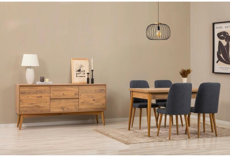 Alakítsa át étkezőjét egy stílusos és funkcionális térré az Extendable Dining Table, Chairs & Console Set szettel. Ez a 6 darabos szett úgy van tervezve, hogy emelje az étkezési élményt, és lenyűgözze vendégeit modern és elegáns dizájnjával. Elegáns dizájn az étkezőjéhezAz étkezőasztal sima Atlanti fenyő felülettel rendelkezik, míg a székek luxus sötétkék szövetbe vannak kárpitozva, ami kifinomult megjelenést kölcsönöz, amely fokozza bármilyen étkező dekorációt. A konzol eleganciát ad hozzá, és további tárolóhelyet biztosít az étkezéshez szükséges dolgoknak. Rugalmas és praktikusA kihúzható étkezőasztal lehetővé teszi, hogy könnyedén több vendéget fogadjon, amikor szükséges, így tökéletes családi összejövetelekhez vagy vacsora partikhoz. A székek ergonomikus kialakításúak a maximális kényelem érdekében, biztosítva a kellemes étkezési élményt minden alkalommal. Magas minőségű anyagokA 100%-ban melamin bevonatú forgácslapból készült étkezőszett tartós és hosszú élettartamú. A lap 18 mm-es vastagsága stabilitást és szilárdságot biztosít, így megbízható választás az étkező bútoraihoz. Műszaki részletek: Anyag: 100% Melamin bevonatú forgácslap Vastagság: 18 mm Étkezőasztal mérete: Szélesség: 130 cm, Magasság: 76 cm, Mélység: 80 cm (1 darab) Kihúzott asztal mérete: Szélesség: 165 cm, Magasság: 76 cm, Mélység: 80 cm Szék mérete: Szélesség: 44 cm, Magasság: 90 cm, Mélység: 46 cm (4 darab) Ülőmagasság: 40 cm, Ülőmélység: 43,5 cm Konzol: Szélesség: 170 cm, Magasság: 82,5 cm, Mélység: 45 cm (1 darab) Konzol láb magassága: 29 cm Szín: Atlanti fenyő és sötétkék Frissítse fel étkezőjét az Extendable Dining Table, Chairs & Console Set szettel, és hozzon létre egy teret, ahol emlékek születnek és osztoznak. Rendelje meg most, és tapasztalja meg a stílus és a funkcionalitás tökéletes egyensúlyát otthonában.