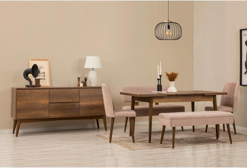 Alakítsa át étkezőjét egy stílusos és hívogató térséggé az Extendable Dining Table, Chairs & Console Set készletünkkel. Ez a 6 darabos szett a melegség és elegancia jegyében készült, így minden étkezés különleges alkalommá válik. Elegancia és Funkcionalitás Ötvözve100%-ban melamin bevonatú forgácslapból készült, ez a szett nemcsak szép, hanem tartós és könnyen karbantartható is. Az állítható étkezőasztal lehetővé teszi, hogy több vendéget fogadjon, amikor szükséges, míg a székek kényelmet és stílust biztosítanak. A konzol egy csipetnyi kifinomultságot ad a szobának, a pad pedig további ülőhelyeket kínál. Teremtsen Tartós EmlékeketKépzelje el, ahogy a családjával körbeülnek ezen a lenyűgöző étkezőszetten, megosztva a nevetéseket és történeteket ízletes ételek mellett. A dió és kő színek modernitást kölcsönöznek a szettnek, így sokoldalú kiegészítője bármilyen otthoni dekorációnak. Műszaki Részletek: Anyag: 100% Melamin bevonatú forgácslap Vastagság: 18 mm Étkezőasztal mérete: Szélesség: 130 cm, Magasság: 76 cm, Mélység: 80 cm (1 darab) Nyitott asztal mérete: Szélesség: 165 cm, Magasság: 76 cm, Mélység: 80 cm Szék mérete: Szélesség: 44 cm, Magasság: 90 cm, Mélység: 46 cm (2 darab) Ülés magassága: 40 cm, Ülés mélysége: 43,5 cm Konzol: Szélesség: 170 cm, Magasság: 82,5 cm, Mélység: 45 cm (1 darab) Konzol láb magassága: 29 cm Pad: Szélesség: 110 cm, Magasság: 46 cm, Mélység: 40 cm (1 darab) Pad láb magassága: 31 cm Bank: Szélesség: 110 cm, Magasság: 82,5 cm, Mélység: 47 cm (1 darab) Bank láb magassága: 31 cm Szín: Dió és Kő