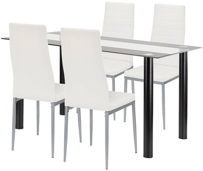Modern Denton étkezőgarnitúra: Stílus és kényelem egyben ?️ A Denton 4+1 étkezőgarnitúra tökéletes választás, ha modern eleganciát és praktikus kényelmet szeretnél otthonodba varázsolni. A szett egy nagyméretű, füstszürke üveglapos asztalból és négy stílusos, fehér textilbőr székből áll, így ideális családi étkezésekhez és vendégfogadáshoz egyaránt. Az asztal főbb jellemzői:Tágas méret: 140 × 80 cm-es asztallap, amely 4-6 fő számára biztosít kényelmes helyet. Elegáns design: Füstszürke, 8 mm vastag edzett üveglap a modern megjelenésért. Stabilitás: Fekete porszórt acél váz a tartósságért és a stabilitásért (max. 60 kg terhelhetőség). Könnyű tisztíthatóság: Az üveglap egyszerűen tisztán tartható. A székek főbb jellemzői:Modern design: Fehér textilbőr ülőfelület és szürke fém lábak a letisztult megjelenésért. Kényelem: Ergonomikus kialakítású, 96 cm magas háttámla és 45 cm-es ülőmagasság a kényelmes ülésért. Stabilitás: Masszív szerkezet, akár 130 kg-os teherbírással. Könnyű összeszerelés: Lapra szerelve szállítjuk a könnyű szállítás érdekében. Kinek ajánljuk? Nagyobb családoknak, akik egy tágas étkezőasztalt keresnek. Modern otthonokba, ahol fontos a stílusos megjelenés. Azoknak, akik értékelik a minőségi anyagokat és a könnyű tisztíthatóságot. Műszaki adatok:Jellemző ÉrtékAsztal mérete 140 × 80 × 75 cmAsztallap anyaga 8 mm vastag edzett üvegAsztallap színe FüstszürkeAsztal váza Porszórt acél, fekete színbenAsztal terhelhetősége 60 kgSzék mérete 50 × 41 × 96 cm (ülőmagasság: 45 cm)Szék anyaga Fehér textilbőr ülőfelület, szürke fém lábakSzék teherbírása max. 130 kgSzínkombináció fehér-szürkeFérőhely 4–6 főTeremts modern és kényelmes étkezőt otthonodban a Denton 4+1 étkezőgarnitúrával! ✨
