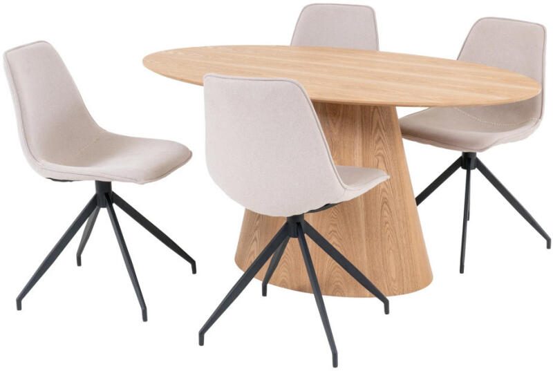 Bolton–Monaco 4+1 beltéri étkezőgarnitúra – világos tölgy, modern stílusban Tartalom: 4 szék + 1 asztal Méret: – Asztal: 120×75×74 cm – Szék: 42×52×94 cm Anyag: MDF és fém kombináció Szín: tölgy-fehér Terméklap: Bolton-Monaco garnitúra Letisztult vonalvezetés, meleg tölgy árnyalat, légies fehér fém lábak – a Bolton-Monaco szett tökéletes választás skandináv vagy modern enteriőrbe. A székek enyhén döntött háttámlája kényelmes ülést biztosít, az asztal ideális 4 fős családi vagy baráti étkezésekhez. Előnye: kis helyen is elfér, mégis tágas és kényelmes – ideális lakásokba, kisebb étkezőkbe.