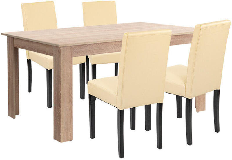 Leziter Leon 4+1 Étkezőgarnitúra - Sonoma Tölgy és Bézs Elegancia ?️ Varázsolja étkezőjét stílusos és kényelmes térré a Leziter Leon étkezőgarnitúrával! Ez a 4 személyes szett tökéletes választás családi vacsorákhoz, baráti összejövetelekhez, vagy akár irodai étkezésekhez. A garnitúra tartalma:1 db Yorki étkezőasztal: Szín: Sonoma tölgy Méretek: 160 cm (hossz) x 90 cm (szélesség) x 76 cm (magasság) Anyag: Strapabíró bútorlap fém sarokmegerősítésekkel Kapacitás: Kényelmesen 4 fő részére, de akár 6-8 fő is elfér Könnyen tisztítható és összeszerelhető4 db Kelly étkezőszék: Szín: Bézs Anyag: Könnyen tisztítható ECO bőr (textilbőr) Ülőfelület: 4 cm vastag habszivacs párna Lábak: Stabil fenyőfa Teljes magasság: 90 cm Ülésmagasság: 48 cm Maximális teherbírás: 120 kgFőbb előnyök: ✅ Modern és letisztult design: A sonoma tölgy és bézs színkombináció elegáns megjelenést kölcsönöz. ? Strapabíró anyagok: A minőségi bútorlap és a stabil fenyőfa lábak hosszú élettartamot garantálnak. ? Könnyen tisztítható: Az ECO bőr felületek egyszerűen tisztán tarthatók. ? Egyszerű összeszerelés: A lapra szerelt kivitelnek köszönhetően gyorsan és könnyen összeszerelhető. ?️ Kényelmes ülések: A vastag habszivacs ülőfelület kényelmes ülést biztosít akár hosszabb vacsorák során is. ?‍?‍?‍? Ideális választás: Otthoni, irodai és vendéglátóipari használatra is tökéletes. Kinek ajánljuk? Akik stílusos és praktikus étkezőgarnitúrát keresnek. Családoknak, akik kényelmes és könnyen tisztítható bútorokat szeretnének. Kávézók, éttermek és irodák számára, ahol fontos a tartósság és a könnyű karbantartás. Teremtsen kellemes és stílusos étkezőt a Leziter Leon 4+1 étkezőgarnitúrával! ✨