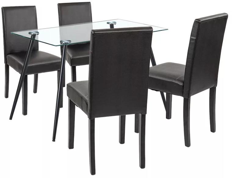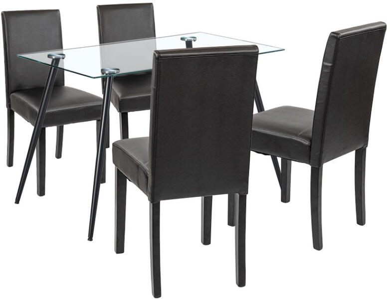 Alen 4+1 étkező garnitúra fekete-fekete Leziter Alen 4+1 étkezőgarnitúra – stílus és kényelem mindennapokra Te is unod már a billegő asztalokat és a kényelmetlen, nyikorgó székeket, amik elrontják a közös étkezések hangulatát? A mindennapi vacsorák, családi ünnepek vagy baráti összejövetelek során mindenki kényelmet és kellemes légkört keres — de egy instabil asztal vagy nehezen tisztítható felületek csak bosszúságot okoznak. Főleg, ha kisgyermekekkel vagy gyakori vendégekkel élsz együtt, ez folyamatos stressz forrása lehet. A Leziter Alen 4+1 étkezőgarnitúra fekete színben ezt a problémát végleg megoldja: kompakt, mégis elegáns szett, amely négy kényelmes széket és egy stabil, praktikus étkezőasztalt kínál — tökéletes választás otthonra, irodába vagy vendéglátóhelyekre egyaránt. Ideális választás kisebb terekbe és közös élményekhez A Leziter Alen 4 személyes étkezőgarnitúra mindent tud, amit egy modern, megbízható bútortól elvársz. Az asztal 8 mm vastag hőkezelt edzett üveglappal készült, mérete 120x70x75 cm, így közepes helyiségekbe is tökéletesen illeszkedik, miközben kényelmes teret biztosít a közös étkezésekhez. A strapabíró fekete fém lábak ipari porfestett bevonattal és műanyag padlóvédő talpakkal rendelkeznek, így garantált a stabilitás és a hosszú élettartam. A garnitúra része négy darab Leziter Kelly szék, amelyek fekete ECO bőr kárpitozásuknak köszönhetően nemcsak elegánsak, hanem rendkívül könnyen tisztíthatók is. A vastag, 4 cm-es habszivacs ülőfelület kényelmet biztosít akár egy hosszabb vacsora során is, a stabil fenyőfa lábak pedig 120 kg-os teherbírásukkal még intenzív használat esetén is megbízható társak maradnak. Kelly szék – stílus, kényelem és praktikum minden napra A Leziter Kelly székek minden ülésnél extra kényelmet kínálnak. A fekete ECO bőr borítás modern, letisztult megjelenést kölcsönöz, miközben egyszerűen tisztán tartható — különösen praktikus választás családok, kávézók vagy éttermek számára. Az ülőfelület belsejében található újrahasznosított habszivacs nemcsak kényelmes, hanem környezetbarát megoldás is. A stabil fenyőfa lábak biztonságot és hosszú élettartamot garantálnak. Így a Kelly szék tökéletes választás éttermekbe, irodai étkezőkbe, rendezvényhelyszínekre és otthoni használatra is. Kelly szék jellemzői: