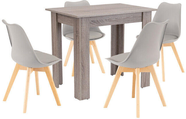 Leziter Amina 4+1 Étkezőgarnitúra: Stílus és Kényelem Egyben ?️ Teremtsen modern és barátságos légkört étkezőjében a Leziter Amina 4+1 étkezőgarnitúrával! Ez az elegáns szett tökéletes választás otthonokba, éttermekbe és irodai konyhákba. A szett tartalma: 4 db Silla étkezőszék 1 db Yorki standard étkezőasztal Silla étkezőszék:Ülőfelület: Prémium polipropilén a könnyű tisztításért Lábak: Bükkfa színű, tartós faanyag Kényelem: Szintetikus textil (PVC) párnázat a hosszantartó komfortért Teherbírás: 120 kg Méretek: Magasság: 81 cm Szélesség: 49 cm Ülésmélység: 43 cm Ülőmagasság: 45 cmYorki étkezőasztal:Asztallap: Magas minőségű, kopásálló bútorlap Felület: Elegáns yorki tölgy mintázat Kivitelezés: Precíz élzárás, strapabíró szerkezet Méretek: Hosszúság: 86 cm Szélesség: 60 cm Magasság: 76 cmTovábbi előnyök:Időtálló dizájn: A szürke-yorki tölgy színkombináció bármely lakberendezési stílushoz illeszkedik. Praktikus használat: Könnyen tisztítható felületek és strapabíró anyagok. Optimális méret: Tökéletes 4 fős családok számára, kisebb terekbe is ideális. Minőségi garancia: A Leziter márka garantálja a tartósságot. A Leziter Amina 4+1 étkezőgarnitúra ideális választás egy stílusos és praktikus étkezőtér kialakításához. ✨