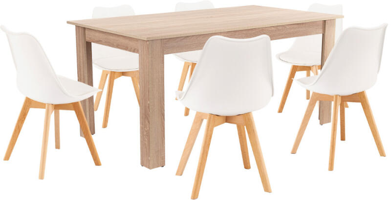 Lola 6+1 étkező garnitúra fehér-sonoma tölgy Elegáns étkezőgarnitúra modern otthonokba A Leziter márka Lola 6+1 étkezőgarnitúrája tökéletes választás modern lakásokba, éttermekbe és stílusos irodai konyhákba egyaránt. A garnitúra 6 db székből és 1 db asztalból, a népszerű Silla étkezőszék és a Yorki standard étkezőasztal harmonikus kombinációjából áll, egyesítve a funkcionalitást az időtlen dizájnnal. Az étkezőszett ideális 6 fő leültetésére és méretei miatt praktikusan elhelyezhető közepes helyiségekbe is. Silla étkezőszék - A modern kényelem új definíciója Ülőfelület: Prémium polipropilén, könnyen tisztítható felülettel Lábak: Bükkfa színű tartós faanyag Kényelmi extra: Szintetikus textil (pvc) anyagú párnázat a hosszan tartó komfortért Teherbírás: 120 kg Étkezőszék mérete: Magasság: 81 cm Szélesség: 49 cm Ülésmélység: 43 cm Ülőmagasság: 45 cm Yorki étkezőasztal - Funkcionalitás találkozik a stílussal Asztallap: Magas minőségű, kopásálló bútorlap Felület: Elegáns sonoma tölgy mintázat Kivitelezés: Precíz élzárás, strapabíró szerkezet Étkezőasztal mérete: Hosszúság: 160 cm Szélesség: 90 cm Magasság: 76 cm Stílusos harmónia és praktikum Időtálló dizájn : A fehér-sonoma tölgy színkombináció örök klasszikus, amely bármely lakberendezési stílushoz illeszkedik. Praktikus használat : Könnyen tisztítható felületek és strapabíró anyagok. Optimális méret : Tökéletes választás 6 fős családok számára, ugyanakkor mérete miatt közepes terekbe is ideális. Minőségi garancia : A Leziter márka többéves bútorgyártási tapasztalata garantálja a tartósságot. Az Lola 6+1 étkező garnitúra ideális választás egy stílusos, időtálló és praktikus étkezőtér kialakításához, ahol minden együtt tökéletes harmóniát sugároz! A Leziter Silla étkezőszékek és a Leziter Yorki standard étkezőasztalok többféle színben és méretben is elérhetőek!