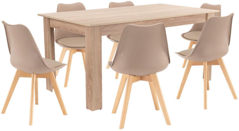 Leziter Lola étkezőgarnitúra: Stílusos és modern étkező 6 főre ?️ Ez a Leziter Lola étkezőgarnitúra tökéletes választás modern otthonokba, éttermekbe vagy stílusos irodai konyhákba. A garnitúra 6 db Silla étkezőszékből és 1 db Yorki étkezőasztalból áll, ötvözve a funkcionalitást a letisztult dizájnnal. Ideális 6 fő számára, mérete miatt pedig közepes méretű helyiségekbe is könnyedén elfér. Silla étkezőszék:Kényelmes: Prémium polipropilén ülés, könnyen tisztítható felülettel és puha PVC párnázattal a maximális komfortért. Tartós: Bükkfa lábakkal, 120 kg-ig terhelhető. Méretek: Magasság: 81 cm, Szélesség: 49 cm, Ülésmélység: 43 cm, Ülőmagasság: 45 cm Yorki étkezőasztal:Stílusos: Sonoma tölgy mintázatú, magas minőségű, kopásálló bútorlappal. Strapabíró: Precíz élzárás és masszív szerkezet. Méretek: Hosszúság: 160 cm, Szélesség: 90 cm, Magasság: 76 cm A garnitúra előnyei:Időtálló dizájn: A bézs és sonoma tölgy színkombinációja bármilyen lakberendezési stílushoz illik. Könnyen tisztítható: A felületek egyszerűen tisztíthatók, így mindig makulátlan marad az étkező. Tökéletes méret: Ideális 6 fős családoknak, de kisebb terekbe is megfelelő. Minőségi anyagok: A Leziter többéves tapasztalata garantálja a tartósságot. Élvezze a stílusos és praktikus étkezőt a Leziter Lola étkezőgarnitúrával! ✨