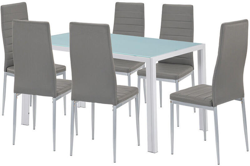Mabel 6+1 Szürke Étkezőgarnitúra: Modern elegancia a mindennapokra ?️ A Mabel 6+1 étkezőgarnitúra tökéletes választás, ha stílusos, kényelmes és praktikus étkezőt szeretnél. A modern design és a szürke színvilág bármely otthonba könnyedén beilleszthető. Főbb jellemzők:Asztal mérete: 140 × 80 × 74 cm Asztallap: 8 mm vastag, edzett üveg a biztonság és tartósság érdekében Asztal lábai: Strapabíró, fehér porfestett fém a stabilitásért Szék mérete: 50 × 41 × 96 cm (ülőmagasság: 45 cm) Szék anyaga: Szürke textilbőr ülőfelület a kényelemért és a könnyű tisztíthatóságért Szék lábai: Fekete vasláb a modern megjelenésért Szék színe: Szürke Terhelhetőség (szék): max. 130 kg Férőhely: 6 fő Miért válaszd a Mabel étkezőgarnitúrát?Modern design: Letisztult vonalak és elegáns megjelenés. Helytakarékos: Ideális kisebb étkezőkbe és konyhákba. Tartós anyagok: Edzett üveg asztallap és strapabíró fém lábak a hosszú élettartamért. Kényelmes székek: Ergonomikus kialakítás a kellemes étkezésekért. Könnyű tisztíthatóság: A textilbőr felület egyszerűen tisztán tartható. Kinek ajánljuk? A Mabel 6+1 étkezőgarnitúra tökéletes választás: Azoknak, akik modern és stílusos étkezőt szeretnének. Kisebb lakásokba, ahol fontos a helykihasználás. Azoknak, akik tartós és megbízható bútort keresnek. Akik szeretik a praktikus és elegáns megoldásokat. Alakítsd át étkeződet a Mabel 6+1 garnitúrával, és élvezd a stílusos és kényelmes étkezéseket! ✨