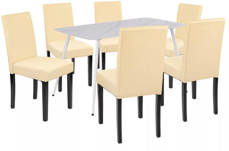 Megan 6+1 étkező garnitúra fehér-bézs Leziter Megan 6+1 étkezőgarnitúra – stílus és tartósság minden napra Unod már a billegő asztalokat és a kényelmetlen, nyikorgó székeket, amik elrontják a közös étkezések hangulatát? A családi vacsorák, ünnepi alkalmak vagy baráti összejövetelek során mindannyian kényelmet és stabilitást keresünk — de egy instabil asztal vagy nehezen tisztítható felületek csak bosszúságot okoznak. Ha kisgyermekekkel vagy gyakori vendégekkel élsz, ez folyamatos stresszforrás lehet. A Leziter Megan 6+1 étkezőgarnitúra fehér-bézs színben ezt a problémát végleg megoldja: modern, elegáns szett, amely hat kényelmes Kelly széket és egy stabil, prémium minőségű étkezőasztalt kínál — tökéletes választás otthonra, irodába vagy vendéglátóhelyekre egyaránt. Masszív, időtálló és elegáns étkezőasztal A Megan 6 személyes étkezőgarnitúra középpontjában a Bora 140 cm szögletes szinterezett kő étkezőasztal áll, amelyet a letisztult, palakő hatású, természetes textúra és a modern design tesz igazán különlegessé. Az asztallap természetes alapanyagokból (agyag és homok) készül, 10.000 tonnás sajtolóval préselve, majd 1200°C-on égetve, így rendkívül ellenálló a karcokkal, foltokkal és hőhatással szemben. Mérete 140x80x75 cm, ezért ideális közepes terekbe is, és kényelmes helyet biztosít 4-6 fő részére. A fehérre festett erős fém lábak stabilitást és masszív tartást garantálnak, míg a műanyag védőtalpak óvják a padlót a sérülésektől. A garnitúra része hat darab Leziter Kelly szék, amelyek bézs ECO bőr kárpitozásuknak köszönhetően nemcsak elegánsak, hanem rendkívül könnyen tisztíthatók is. A vastag, 4 cm-es habszivacs ülőfelület kényelmet biztosít akár egy hosszabb vacsora során is, a stabil fenyőfa lábak pedig 120 kg-os teherbírásukkal még intenzív használat esetén is megbízható társak maradnak. Kelly szék – stílus, kényelem és praktikum minden napra A Leziter Kelly székek minden ülésnél extra kényelmet kínálnak. A bézs ECO bőr borítás modern, letisztult megjelenést kölcsönöz, miközben egyszerűen tisztán tartható — különösen praktikus választás családok, kávézók vagy éttermek számára. Az ülőfelület belsejében található újrahasznosított habszivacs nemcsak kényelmes, hanem környezetbarát megoldás is. A stabil fenyőfa lábak biztonságot és hosszú élettartamot garantálnak. Így a Kelly szék tökéletes választás éttermekbe, irodai étkezőkbe, rendezvényhelyszínekre és otthoni használatra is. Kelly szék jellemzői: