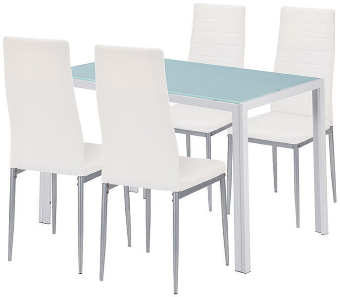 Midland Modern Étkező Garnitúra 4+1 - Stílus és Kényelem Egyben! ?️ A Midland 4+1 étkező garnitúra tökéletes választás modern otthonokba, ahol a stílus, a kényelem és a funkcionalitás egyaránt fontos. Ez a garnitúra letisztult designjával és praktikus kialakításával minden étkezést különlegessé tesz. Főbb Jellemzők:Asztal: Méretek: 120 × 70 × 74 cm Asztallap: 8 mm vastag, hőkezelt, edzett üveg - a biztonság és tartósság érdekében Lábak: Strapabíró, fehér színű, porfestett fém - a stabilitásért és a modern megjelenésértSzékek: Méretek: 50 × 41 × 96 cm (ülőmagasság: 45 cm) Anyag: Textilbőr kárpit - könnyen tisztítható és elegáns Lábak: Szürke porszórt fém - a tartósságért és a stílusos megjelenésértTovábbi Előnyök: Szín: Fehér asztal, fehér-szürke székek Terhelhetőség (szék): max. 130 kg Kialakítás: Letisztult, modern, könnyen kombinálható stílus Férőhely: max. 6 főMiért Válaszd a Midland Étkező Garnitúrát?Modern Design: A fehér és szürke színkombináció elegáns megjelenést kölcsönöz az étkezőnek. Kényelmes Ülés: A textilbőr székek kényelmes ülést biztosítanak a hosszabb étkezésekhez is. Tartós Anyagok: Az edzett üveglap és a fém lábak garantálják a hosszú élettartamot. Helytakarékos: Kisebb étkezőkbe is ideális választás. Könnyen Tisztítható: A textilbőr és az üvegfelület egyszerűen tisztán tartható. Kinek Ajánljuk? Modern otthonokba, ahol fontos a stílus és a funkcionalitás. Kis lakásokba vagy étkezőkbe, ahol számít a helytakarékosság. Családoknak, akik egy elegáns, de praktikus étkezőbútort keresnek. Ne mondj le sem a kényelemről, sem a megjelenésről – válaszd a Midland 4+1 étkezőgarnitúrát, és tedd stílusossá minden étkezésed!